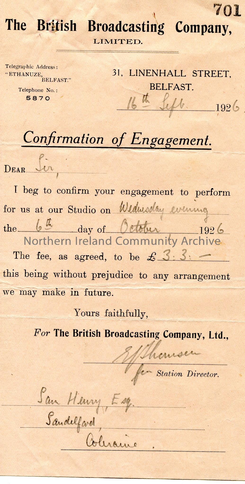 Printed and handwritten letter on headed paper to Sam Henry, Sandelford, Coleraine. Confirmation of Engagement for broadcast on Wednesday evening, 6th October, 1926 for £3.3.0.