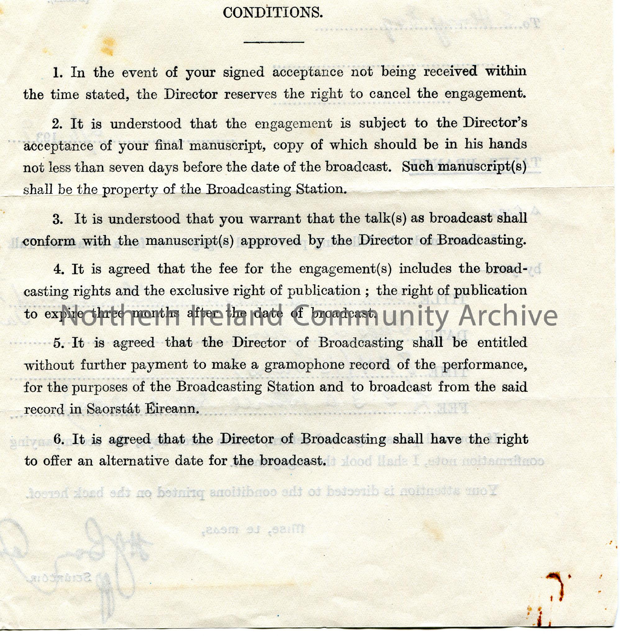 Printed and handwritten letter on headed paper to Sam Henry. Writng re provisional engagement for a broadcast Talk by Sam titled, 'Sam Henry Tells a Rathlin Island Folk Tale.' Sam to sign and return note that accompanied letter. Conditions printed on back of page.