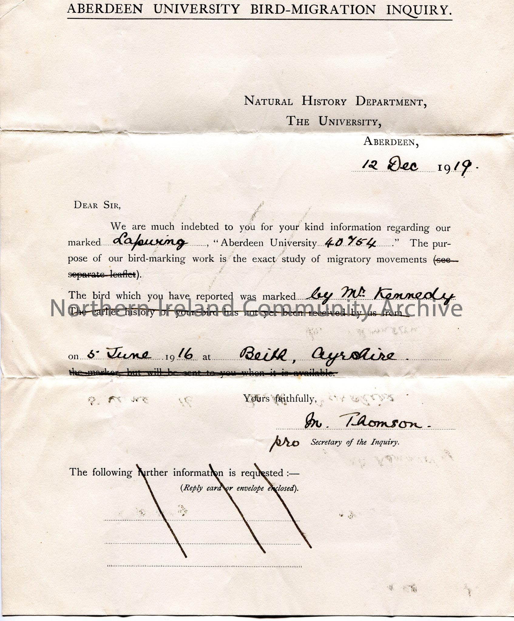 Printed and handwritten letter to Sam Henry headed 'Aberdeen University Bird-Migration Inquiry'. Thanks Sam for information re their marked Lapwing - 40754. It was marked by Mr Kennedy on 5th June 1916 at Beith, Ayrshire.