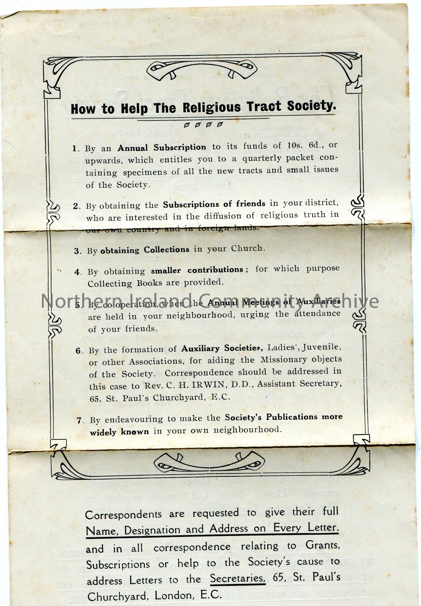 Printed and handwritten notice to Sam Henry from 'The Religious Tract Society' informing him that he has been granted books for Sunday School Library at half price. List of 7 ways of 'How to Help The Religious Tract Society' on back of page.