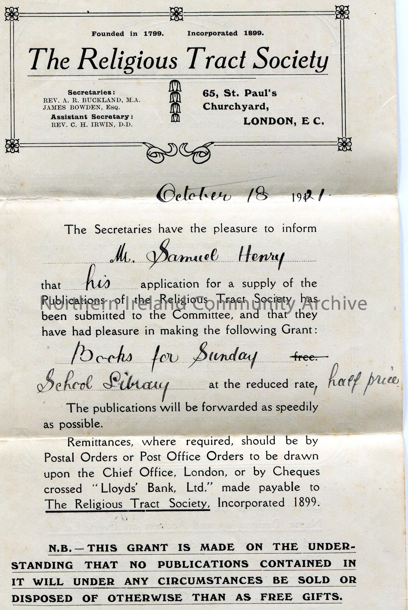Printed and handwritten notice to Sam Henry from 'The Religious Tract Society' informing him that he has been granted books for Sunday School Library at half price. List of 7 ways of 'How to Help The Religious Tract Society' on back of page.