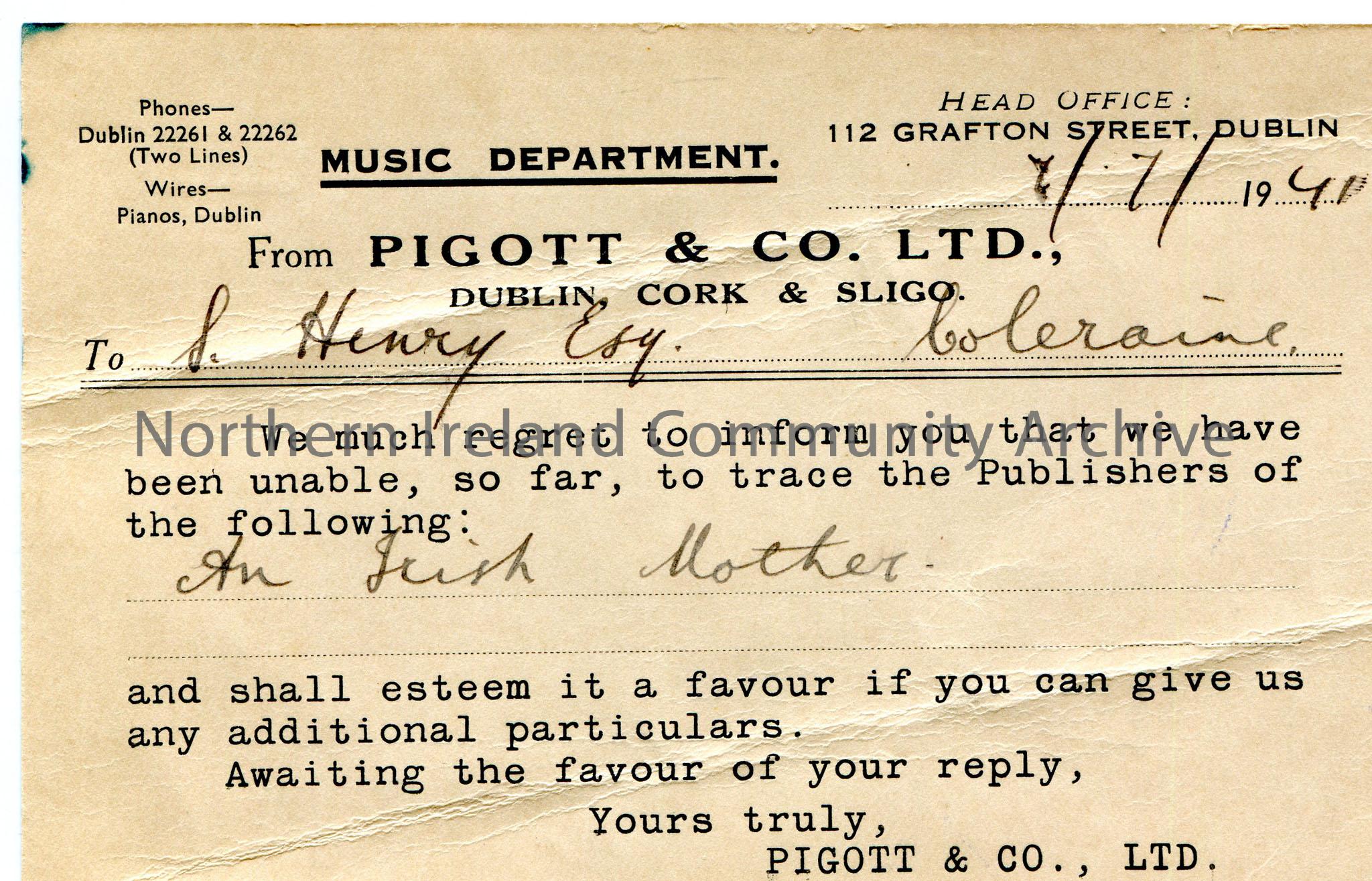 Printed and handwritten postcard to Sam Henry Esq, Coleraine. Informs Sam they have been unable to trace the Publishers of the song - 'An Irish Mother'.
