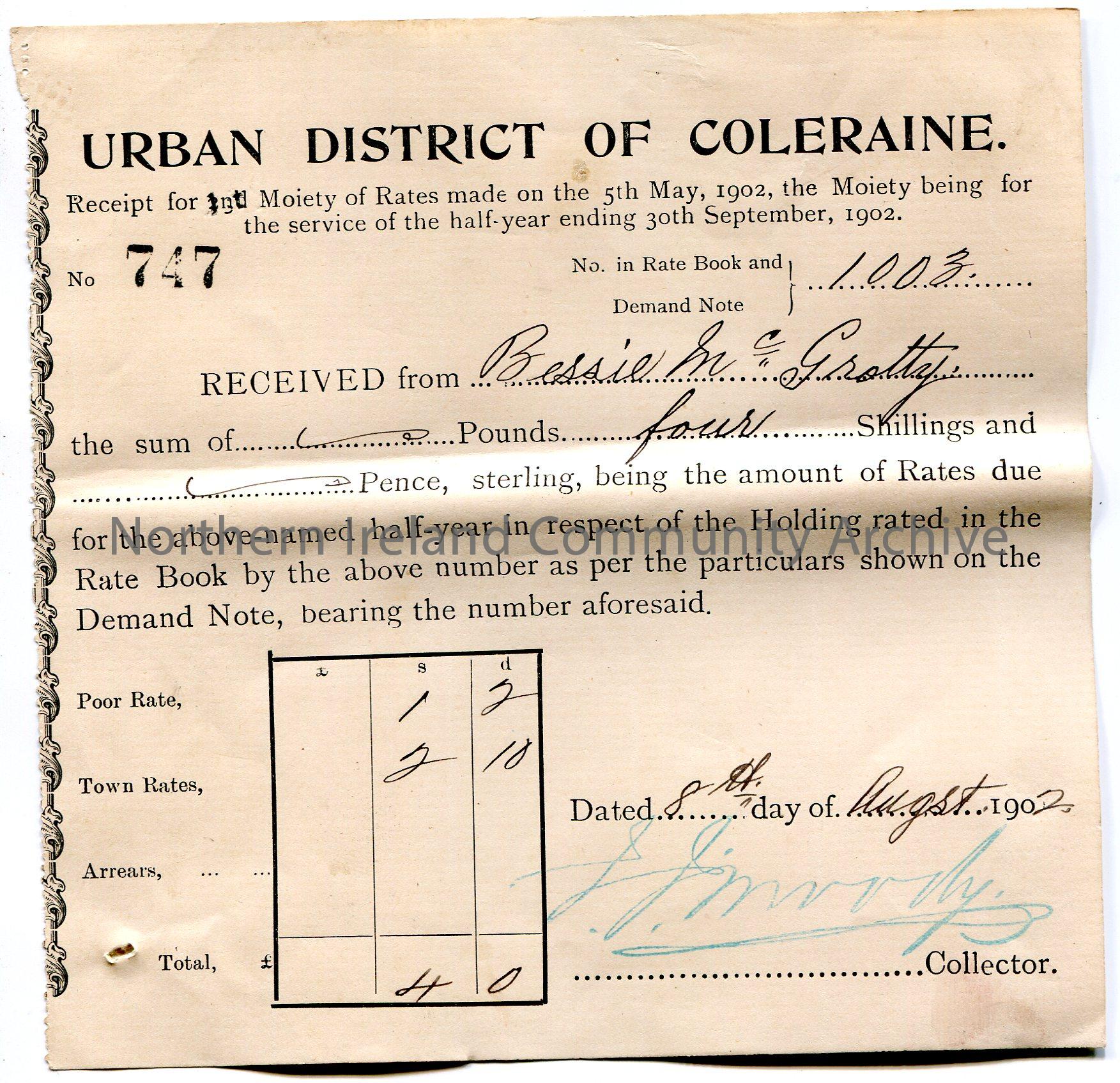 Printed and handwritten receipt for half year rates ending 30th September, 1902 for a property. Receipt no. 747. Issued by Urban District of Coleraine. Signed by J J Moody, Collector. Payment received from Bessie McGrotty for £0.4.4. Dated 8th August, 1902.