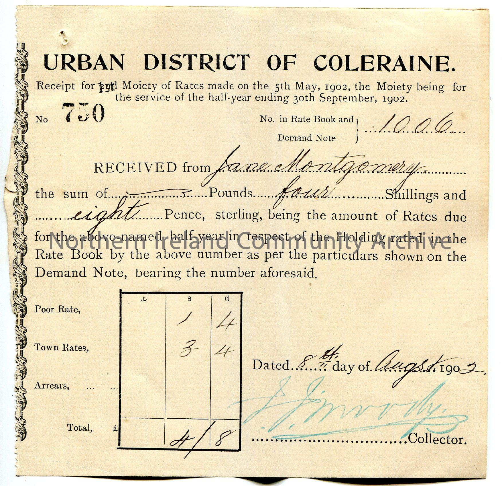 Printed and handwritten receipt for half year rates ending 30th September, 1902 for a property. Receipt no. 750. Issued by Urban District of Coleraine. Signed by J J Moody, Collector. Payment received from Bessie McGrotty for £0.4.8. Dated 8th August, 1902.