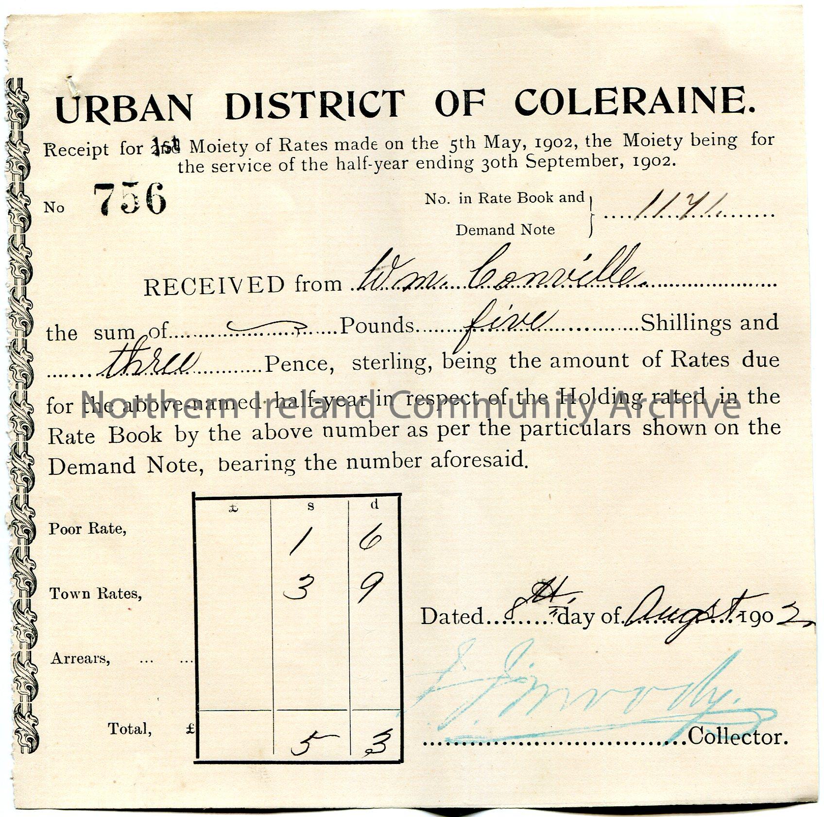 Printed and handwritten receipt for half year rates ending 30th September, 1902 for a property. Receipt no. 756 Issued by Urban District of Coleraine. Signed by J J Moody, Collector. Payment received from Wm [William] Conville for £0.5.3. Dated 8th August, 1902.