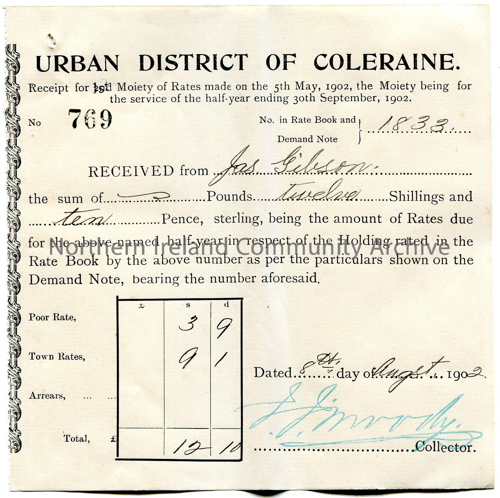 Printed and handwritten receipt for half year rates ending 30th September, 1902 for a property. Receipt no. 769. Issued by Urban District of Coleraine. Signed by J J Moody, Collector. Payment received from Jas Gibson for £0.12.10. Dated 8th August, 1902.