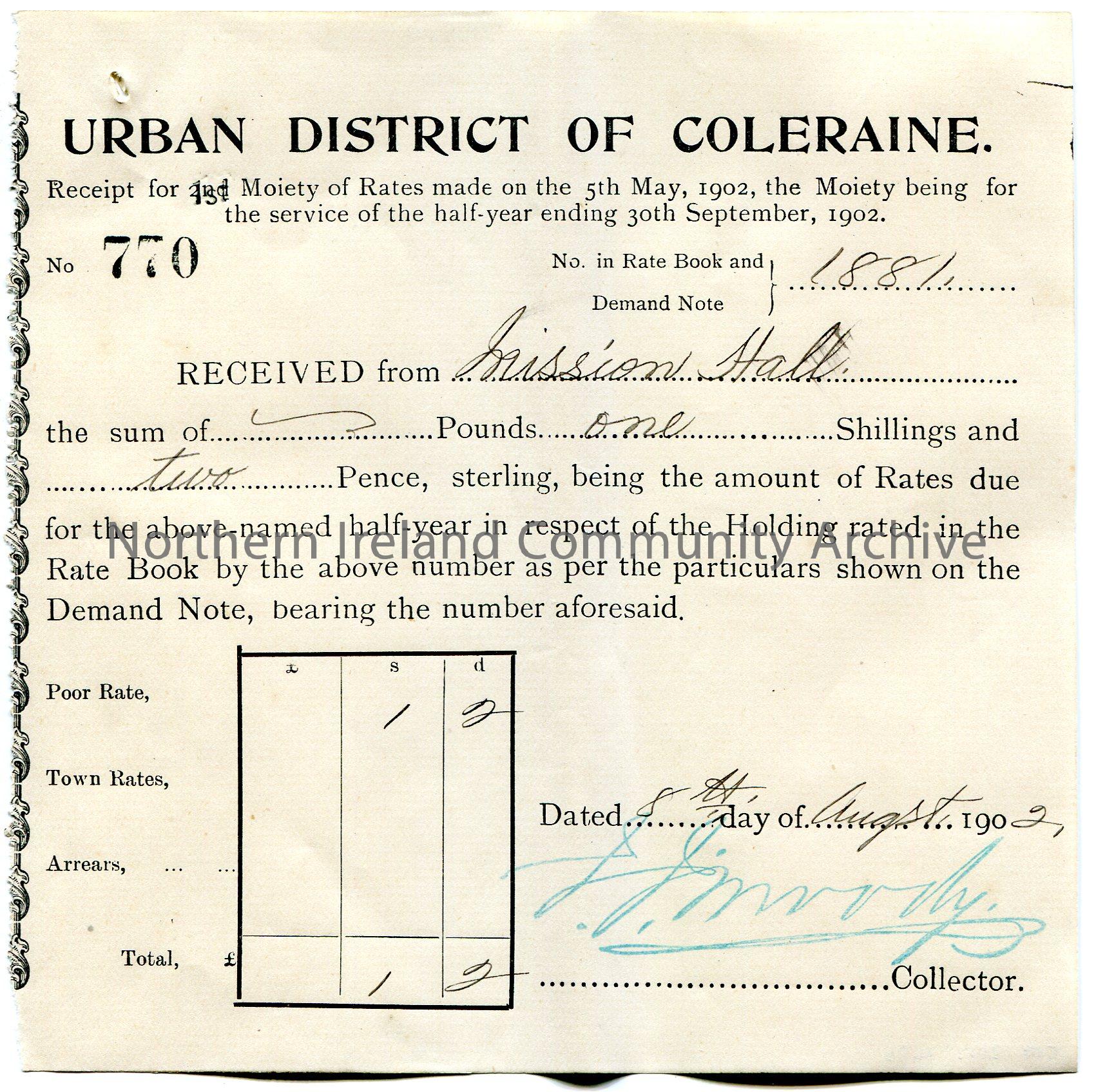 Printed and handwritten receipt for half year rates ending 30th September, 1902 for a property. Receipt no. 770. Issued by Urban District of Coleraine. Signed by J J Moody, Collector. Payment received from Inission Hall for £0.1.2. Dated 8th August, 1902.