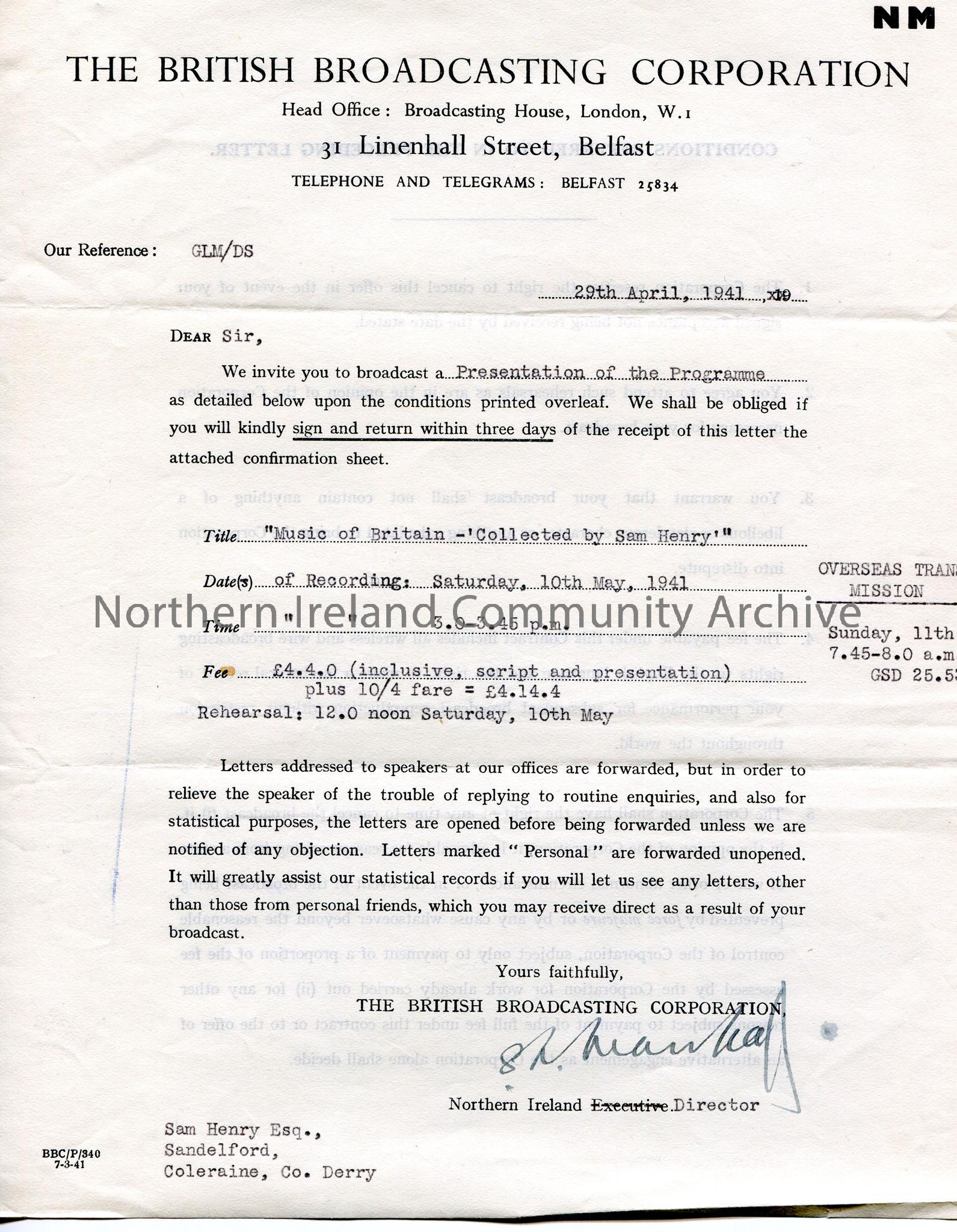 Printed and typed contract to Sam Henry, Sandelford, Coleraine, Co. Derry. Confirmation to broadcast a Presentation of the Programme - 'Music of Britain - Collected by Sam Henry' on Saturday 10th May, 1941 at 3.00-3.45pm for £4.4.0. Overseas transmission to take place Sunday 11th May at 7.45-8.00am. Conditions of the contract are on the back of the page.
