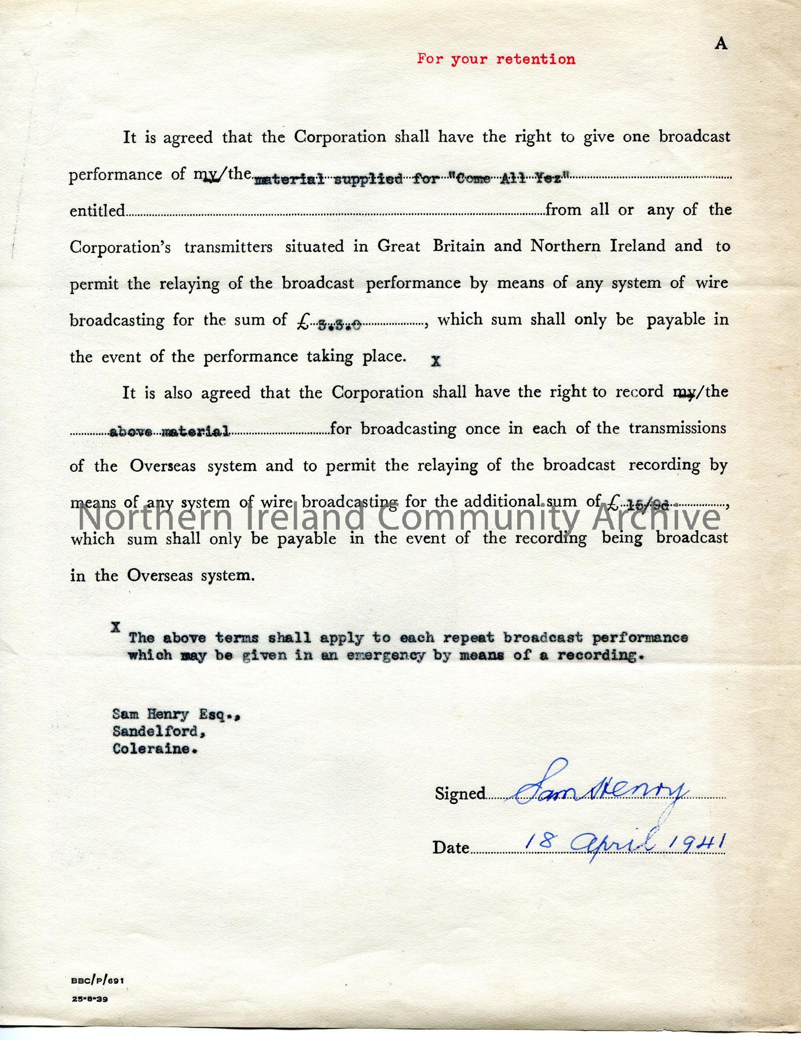 Printed and typed copyright agreement of Sam Henry, Sandelford, Coleraine, Co.Londonderry. 'For your retention' typed at top of page. Confirmation from Sam for the material supplied for 'Come All Yez' at £3.3.0. Additional performances of the programme are subject to a fee of £15/9d. Code at bottom of page - BBC.P/691 25.8.39. Signed and dated by Sam Henry.