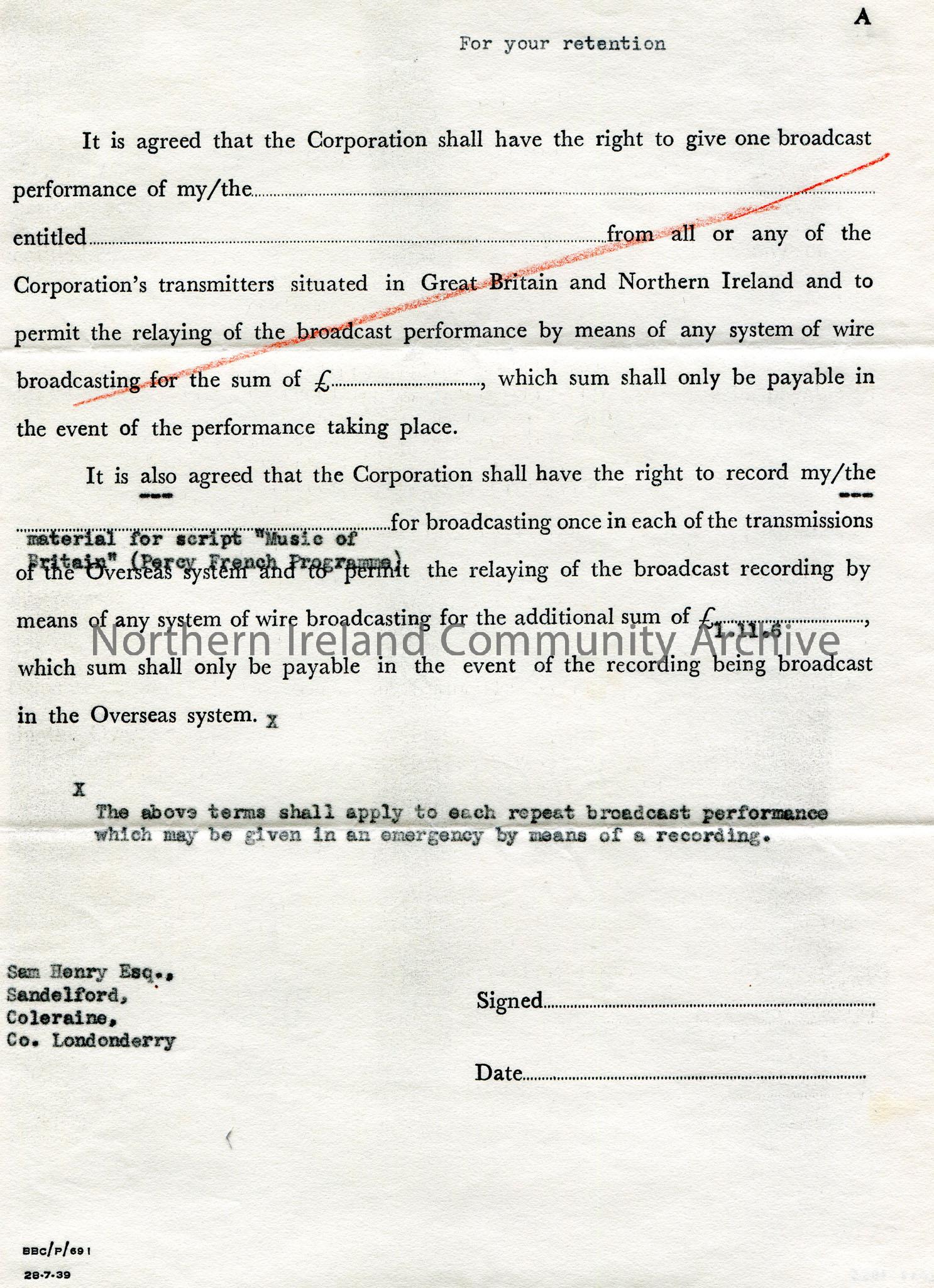 Printed and typed copyright agreement of Sam Henry, Sandelford, Coleraine, Co.Londonderry. 'For your retention' typed at top of page. First part relating to broadcast of programmes in Great Britain and Northern Ireland is scored out. The second paragraph relates to Overseas broadcasts of programmes - material for the script 'Music of Britain' (Percy French Programme). Additional performances of the programme are subject to a fee of £1.11.6. Code at bottom of page - BBC.P/691 28.7.39.