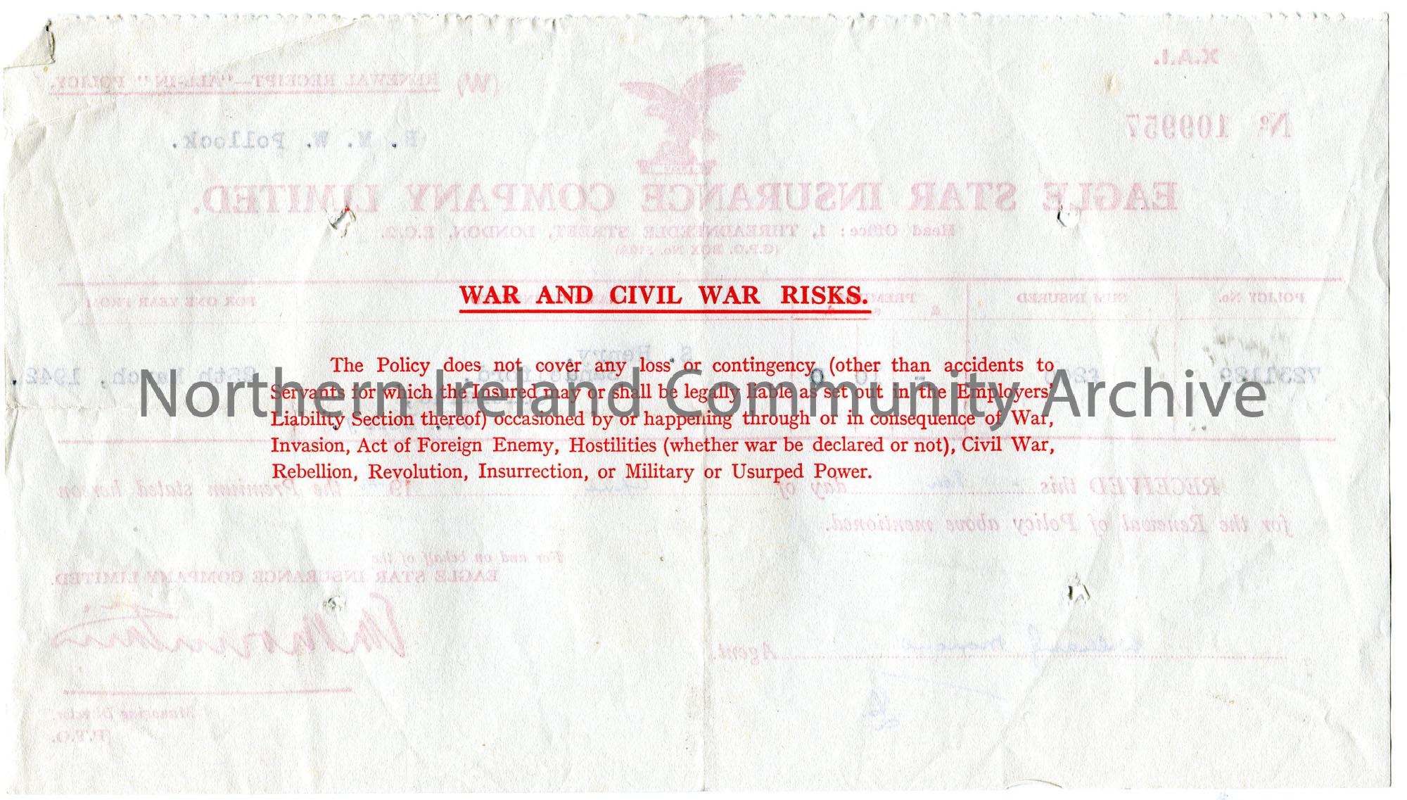 Printed and typed insurance certificate renewal receipt from 'Eagle Star Insurance Company Limited'. Policy no. 7231129 for the sum of £200. Premium cost of £0.10.0. Name of insured stated as S. Henry, Sandelford, Coleraine, Co. Derry. 12 month policy from 25th March 1942. Signed by William J Marcus, Agent. The name R. M. W. Pollock typed near top of page.