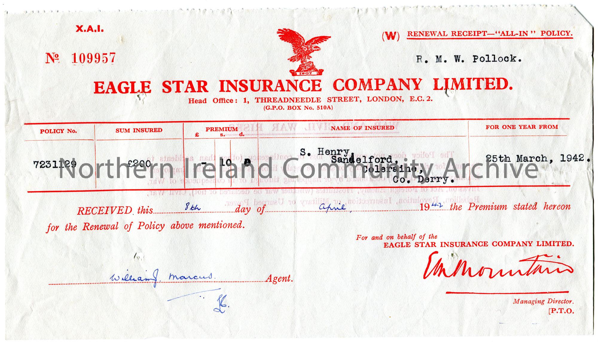 Printed and typed insurance certificate renewal receipt from 'Eagle Star Insurance Company Limited'. Policy no. 7231129 for the sum of £200. Premium cost of £0.10.0. Name of insured stated as S. Henry, Sandelford, Coleraine, Co. Derry. 12 month policy from 25th March 1942. Signed by William J Marcus, Agent. The name R. M. W. Pollock typed near top of page.