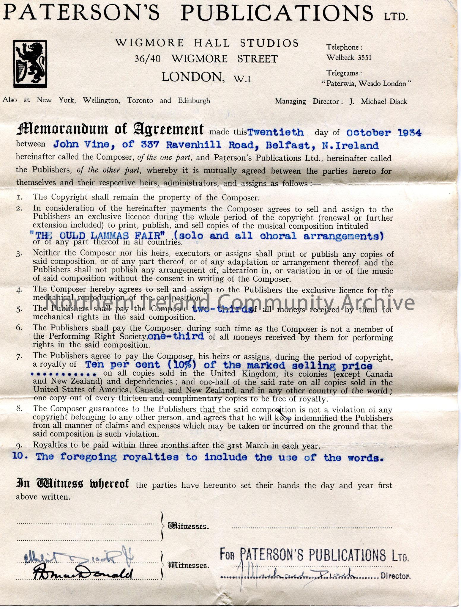 Printed and typed memorandum of agreement on headed paper on 20th October, 1934 between John Vine and Paterson's Publications Ltd for use of the song, including royalties, 'The Ould Lammas Fair'.