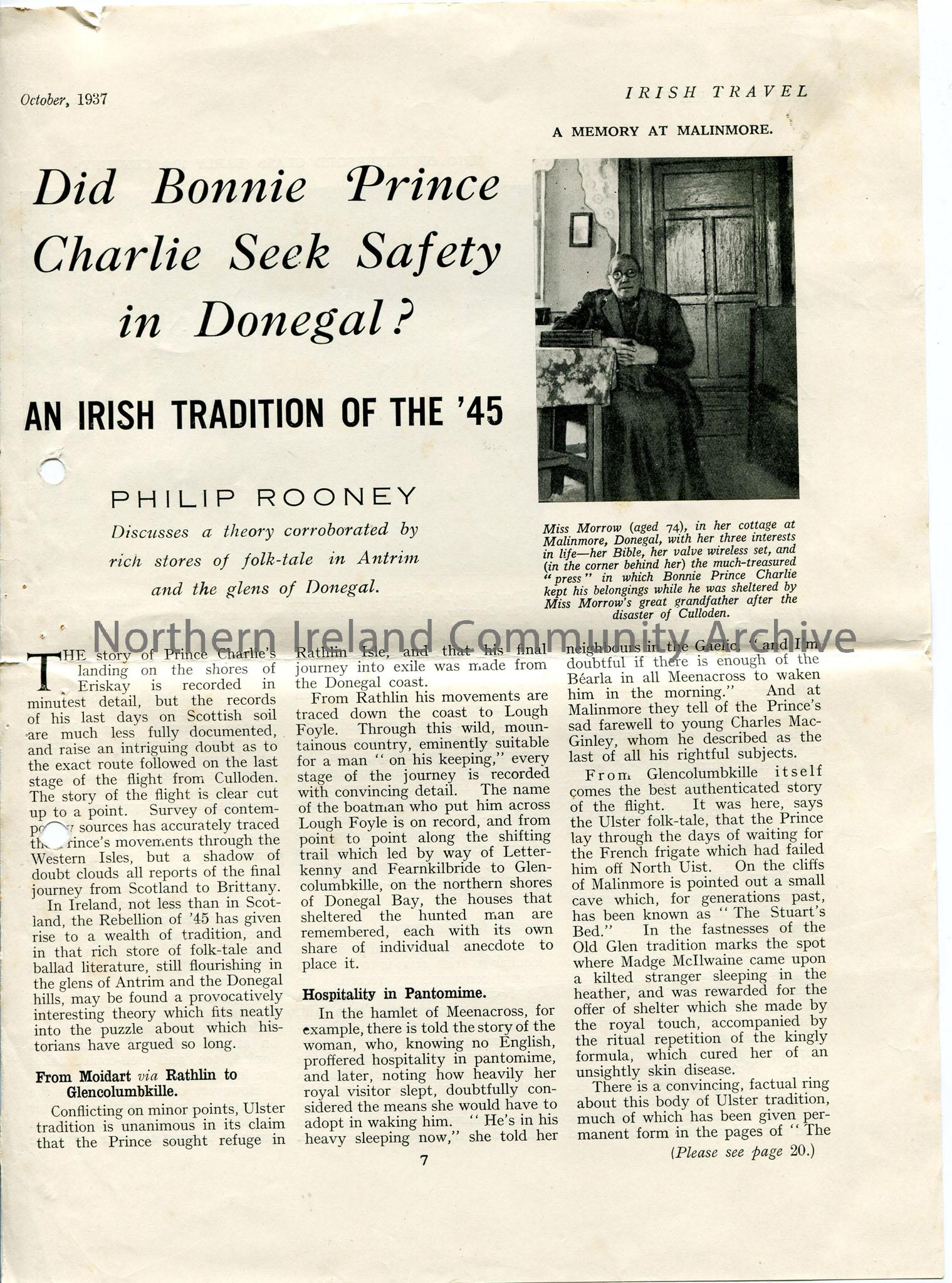 Printed article entitled 'Did Bonnie Prince Charlie Seek Safety in Donegal?' Describes the 'rich stories of folk-tale' about his stay, his farewell to a Charles McGinley, his stay with the grandfather of a Miss Morrow - accompanied by photo of her with press he kept belongings in. Mentions Charlie had Irish companions throughout his attempt to recapture Scottish Crown