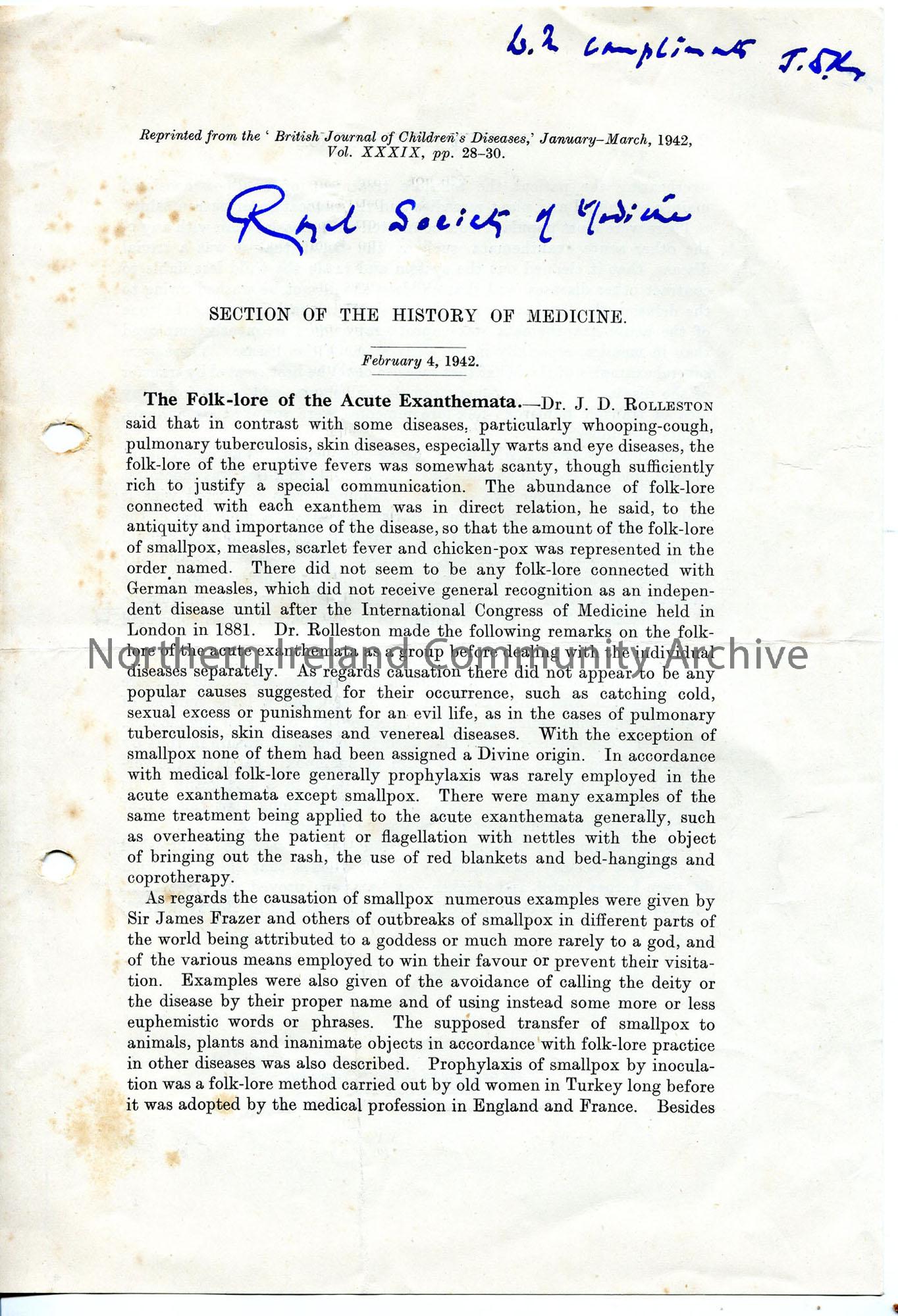 Printed article ‘The Folklore of the Acute Exanthemata’ in the History of Medicine section of the British Journal of Children’s Diseases, mentioning J…