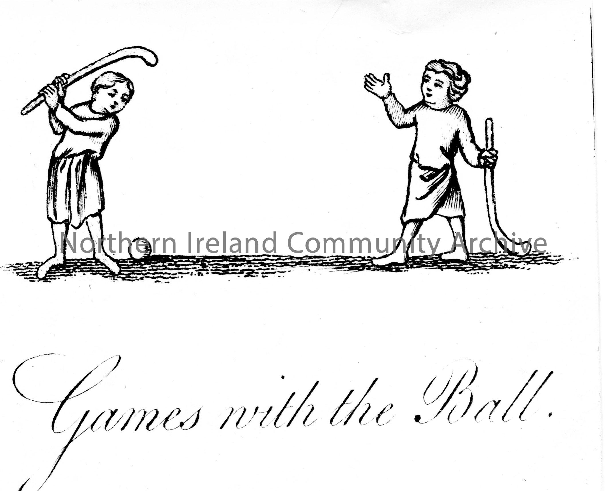 Printed black and white illustration. Image of two children playing with bats and a ball and captioned 'Games with the Ball'. Top part of image used in Sam Henry's 'Dunluce and Giant's Causeway' book - CM:2011:518 on page 8. Captioned, 'Golf in 1397. From a stained glass window in Gloucester Cathedral'. Handwritten on reverse in pencil - 'Glasgow 1697. Stationery Manufd for sale. Golf as played in 1397. Cut'.