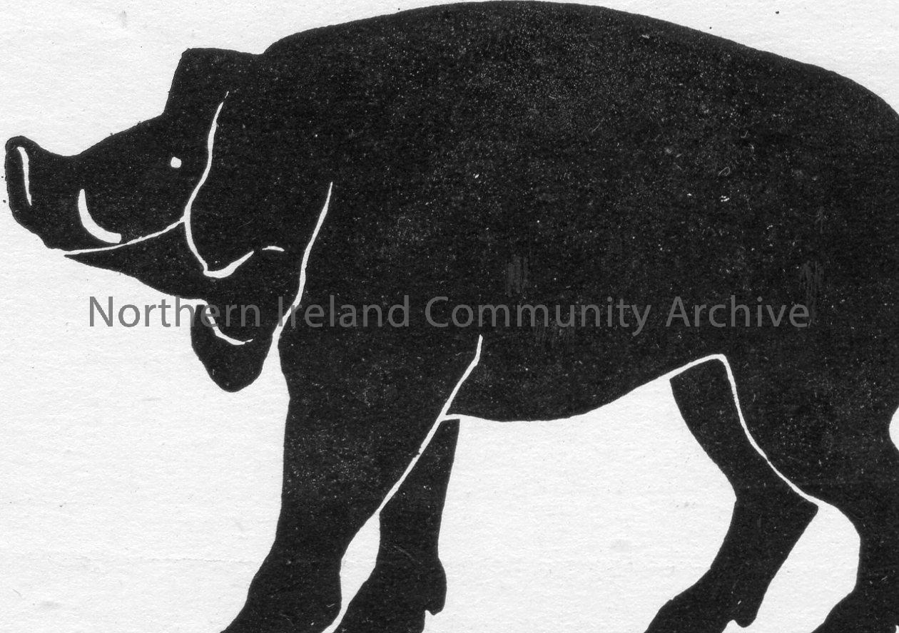 Printed black and white illustration of a pig. Image used in Sam Henry’s book ‘Dunluce and Giant’s Causeway’ on page 80. Captioned ‘Freia’s Boar. The …