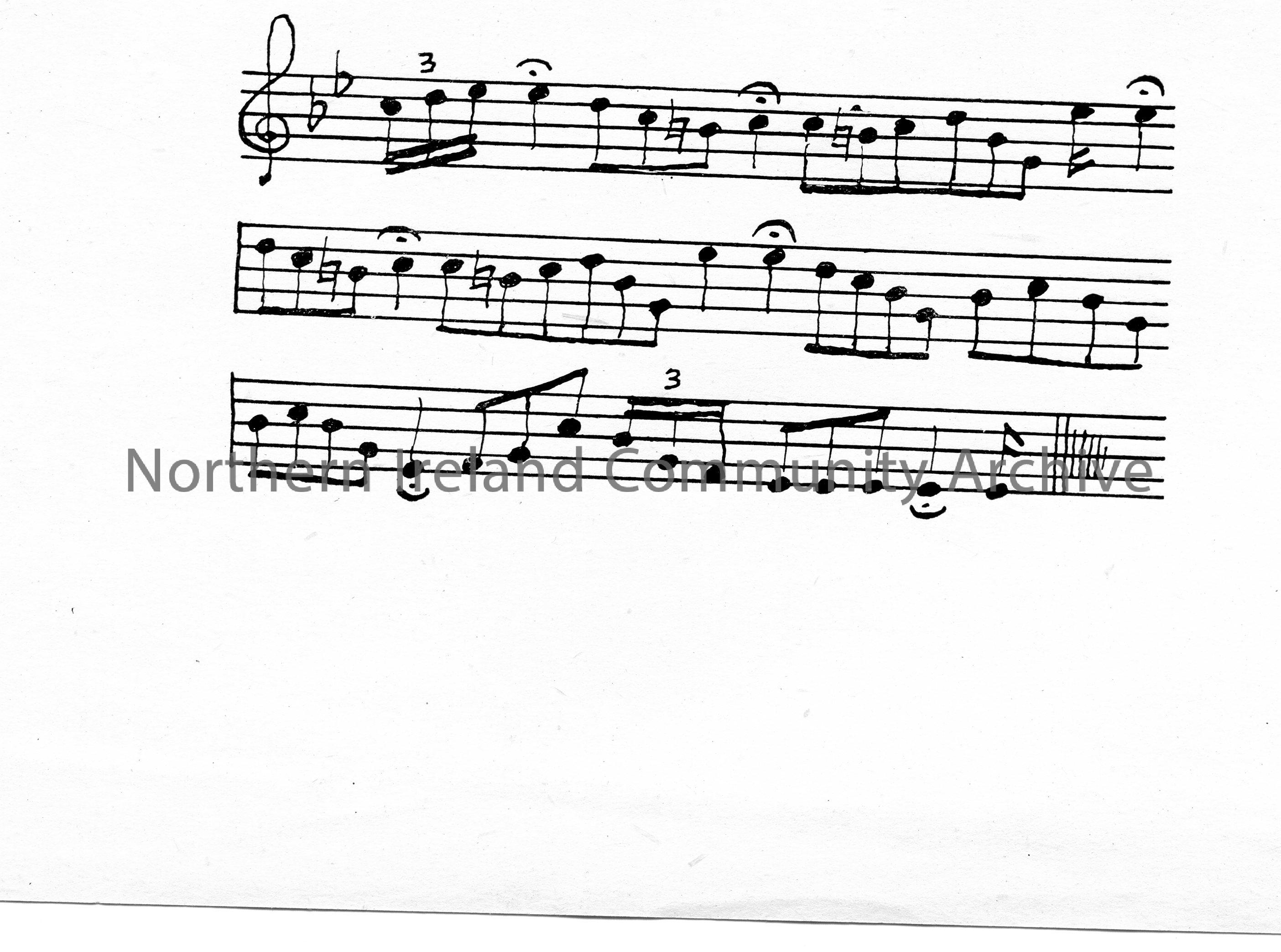 Printed black and white image of bars of music. Image used in Sam Henry’s book ‘Dunluce and Giant’s Causeway’ on page 24. Captioned ‘The Wail of the B…