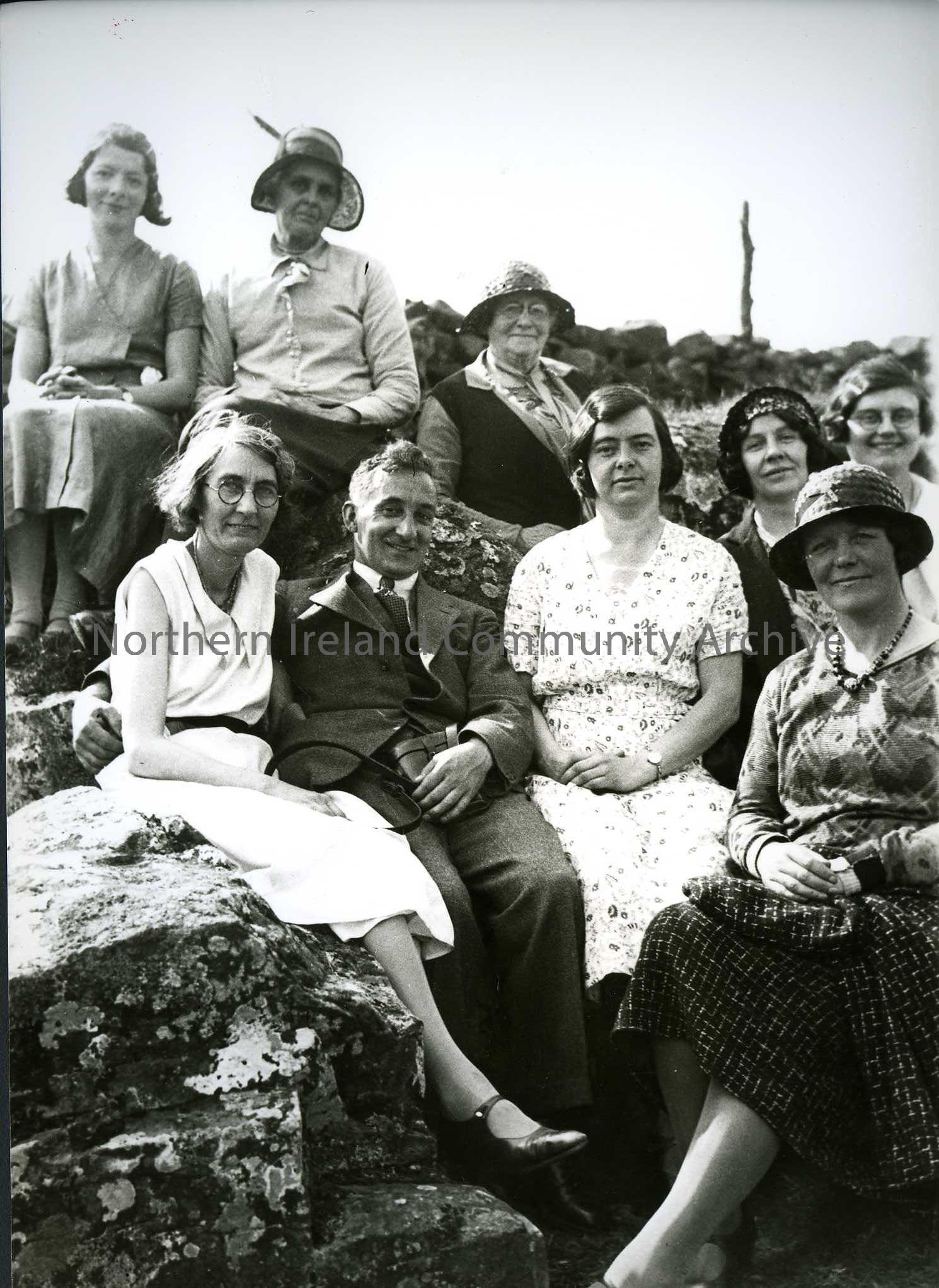 Printed black and white photograph – A gentleman with a group of ladies sitting on a rock.