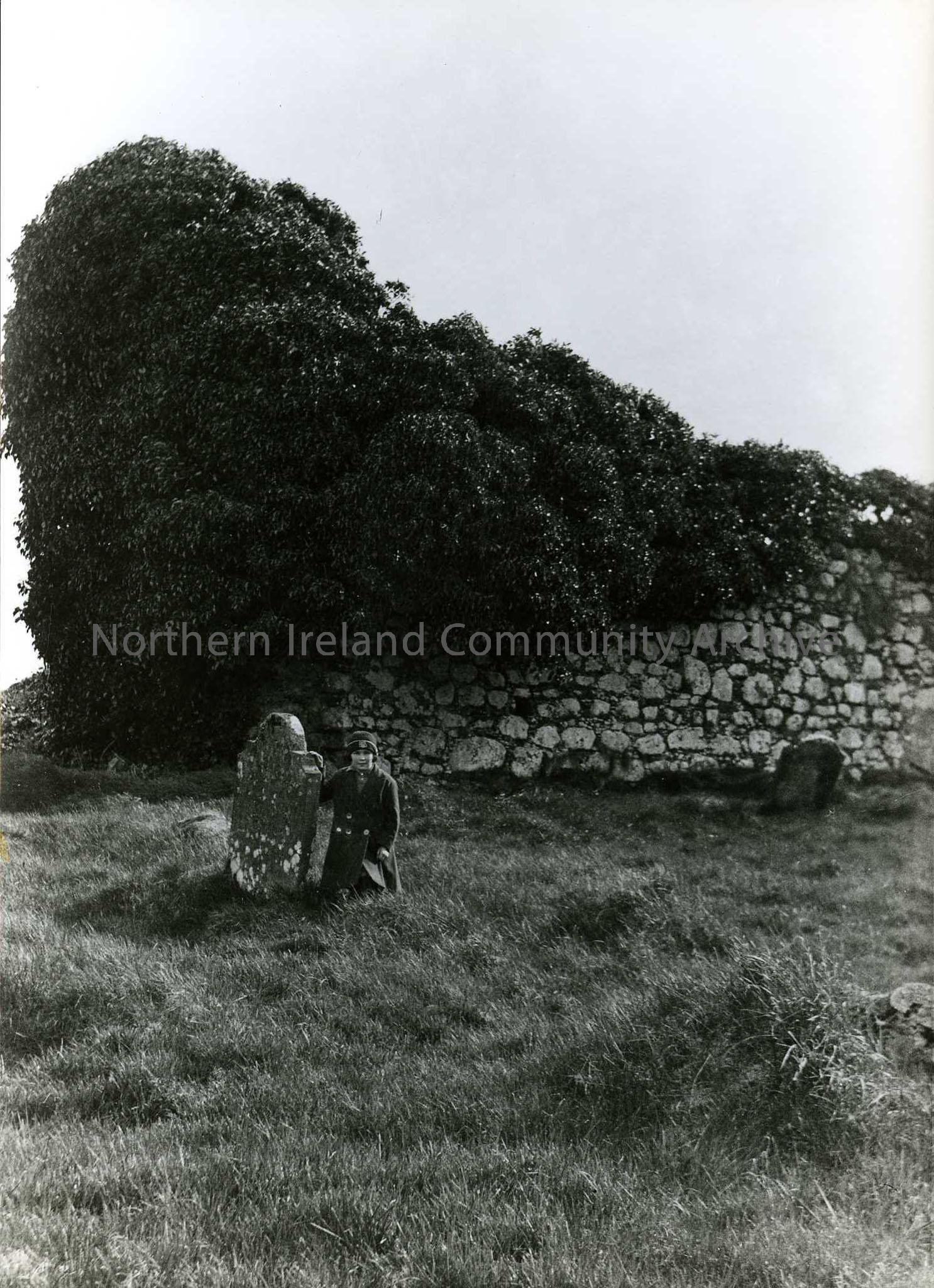 Printed black and white photograph – Church ruin? Olive Craig (nee Henry, Sam’s daughter) sits beside a gravestone.