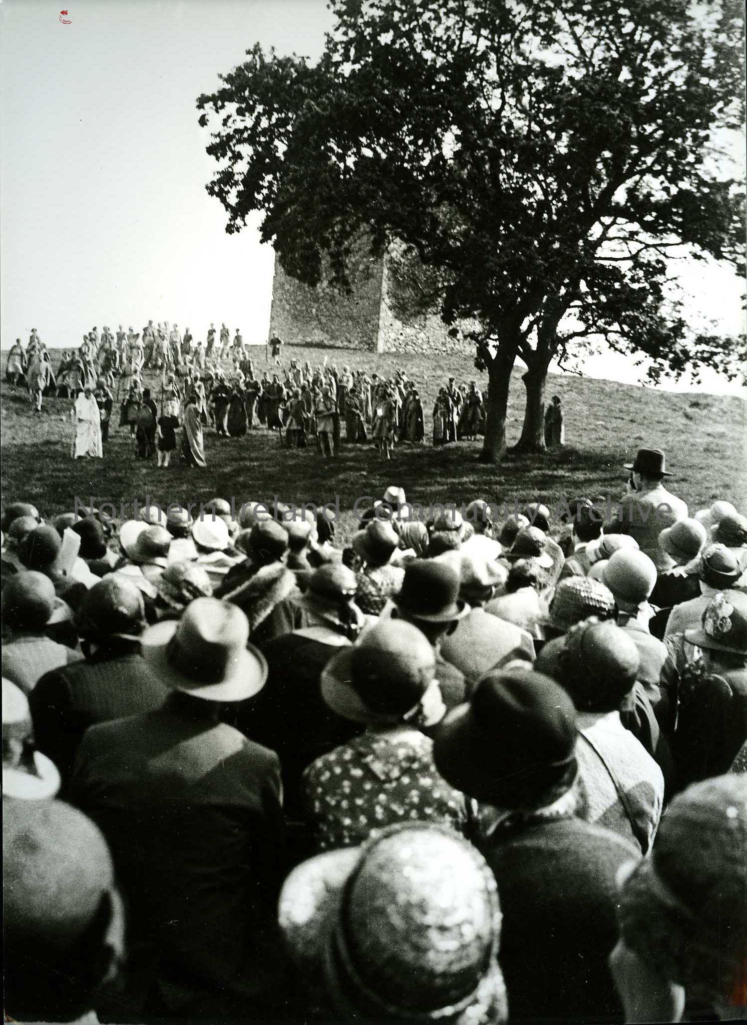 Printed black and white photograph – Crowd of people watching a play/event. People dressed up in cloaks, stone structure in the background.