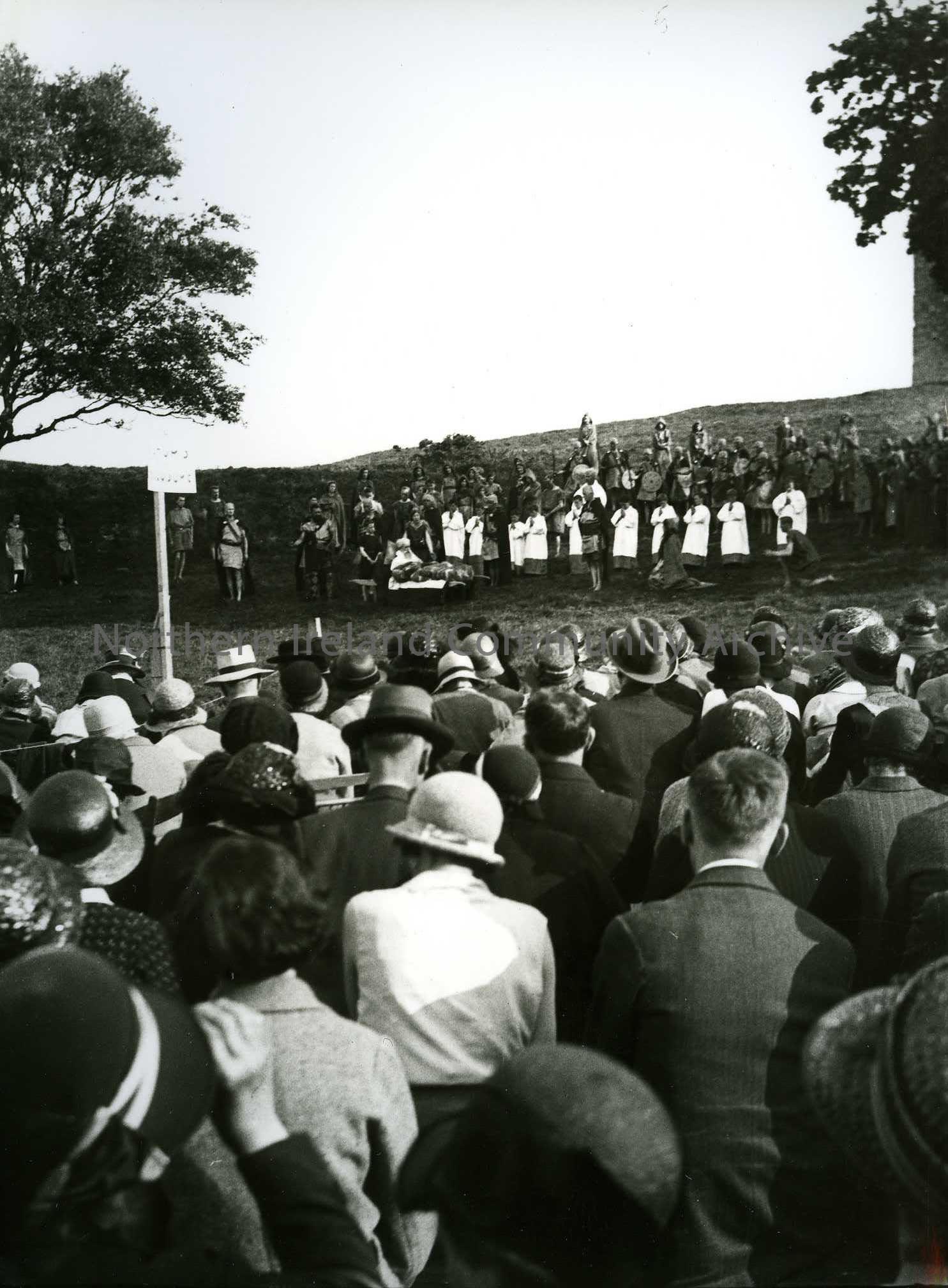 Printed black and white photograph - Crowd watching an event/play. Elderly man lies on a cart and is surrounded by various people from men in battle armour to boys in Church robes.
