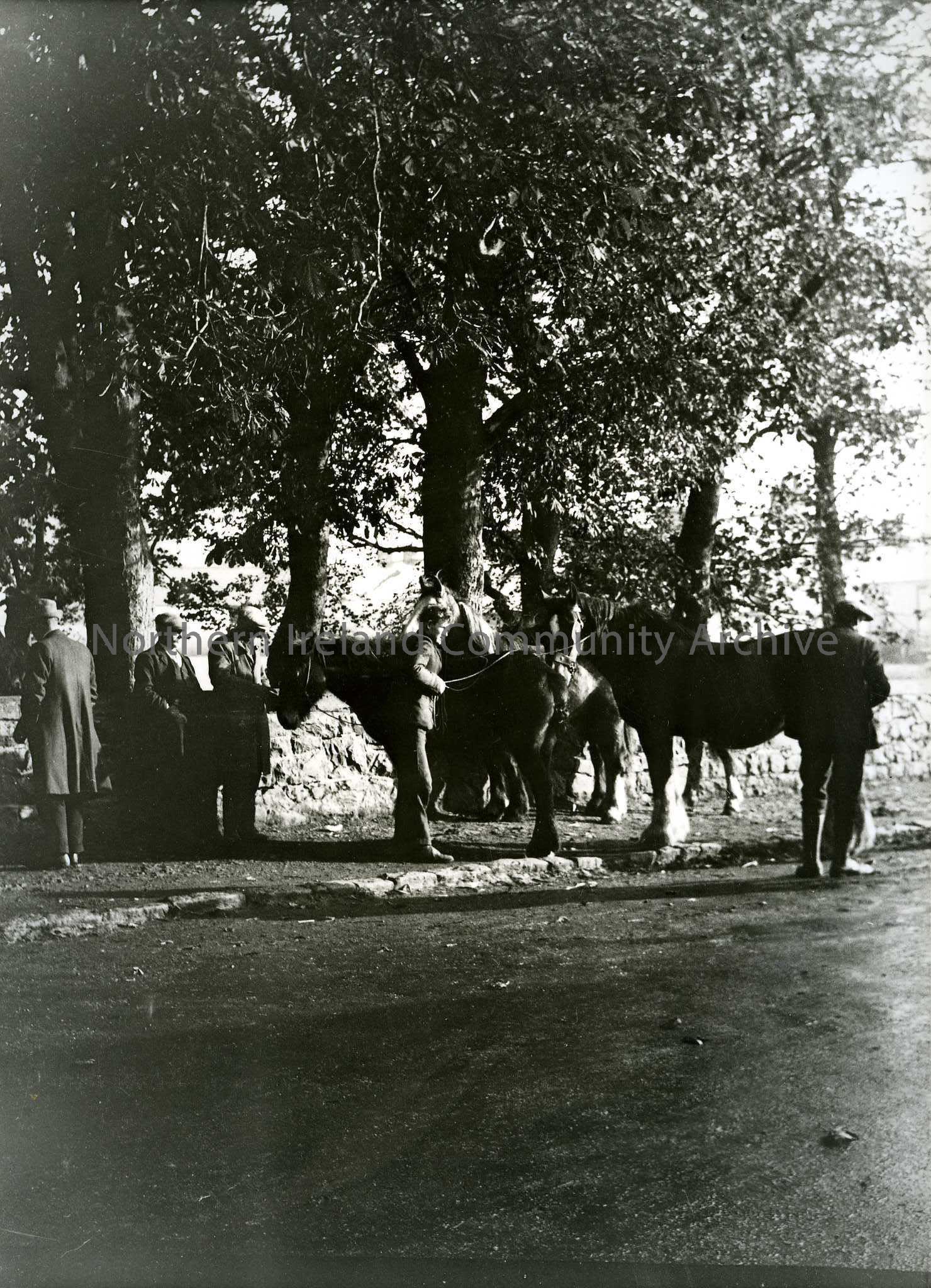 Printed black and white photograph – Men standing on a road edge with horses.