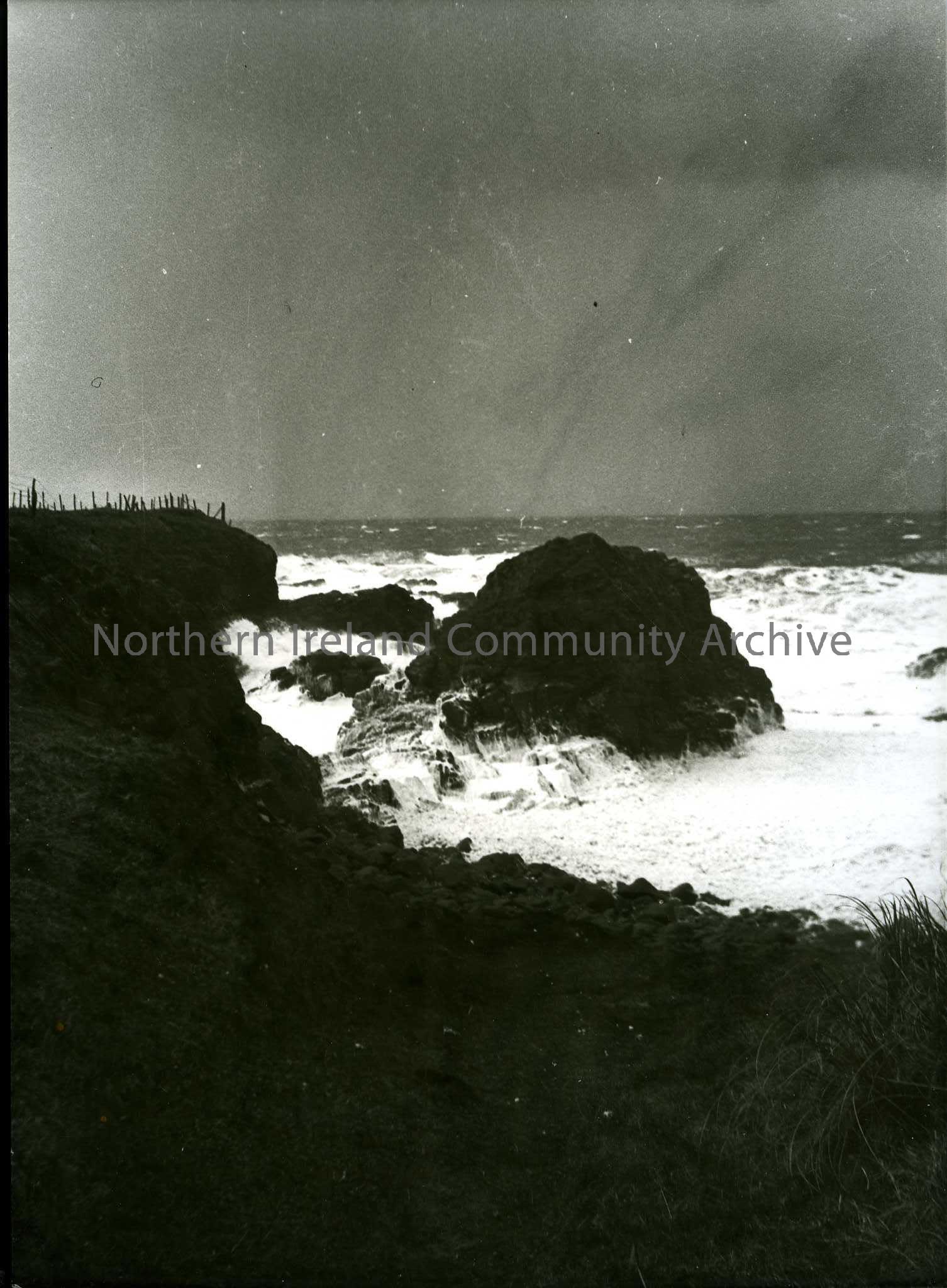 Printed black and white photograph - Sea, rocks and cliff edge.