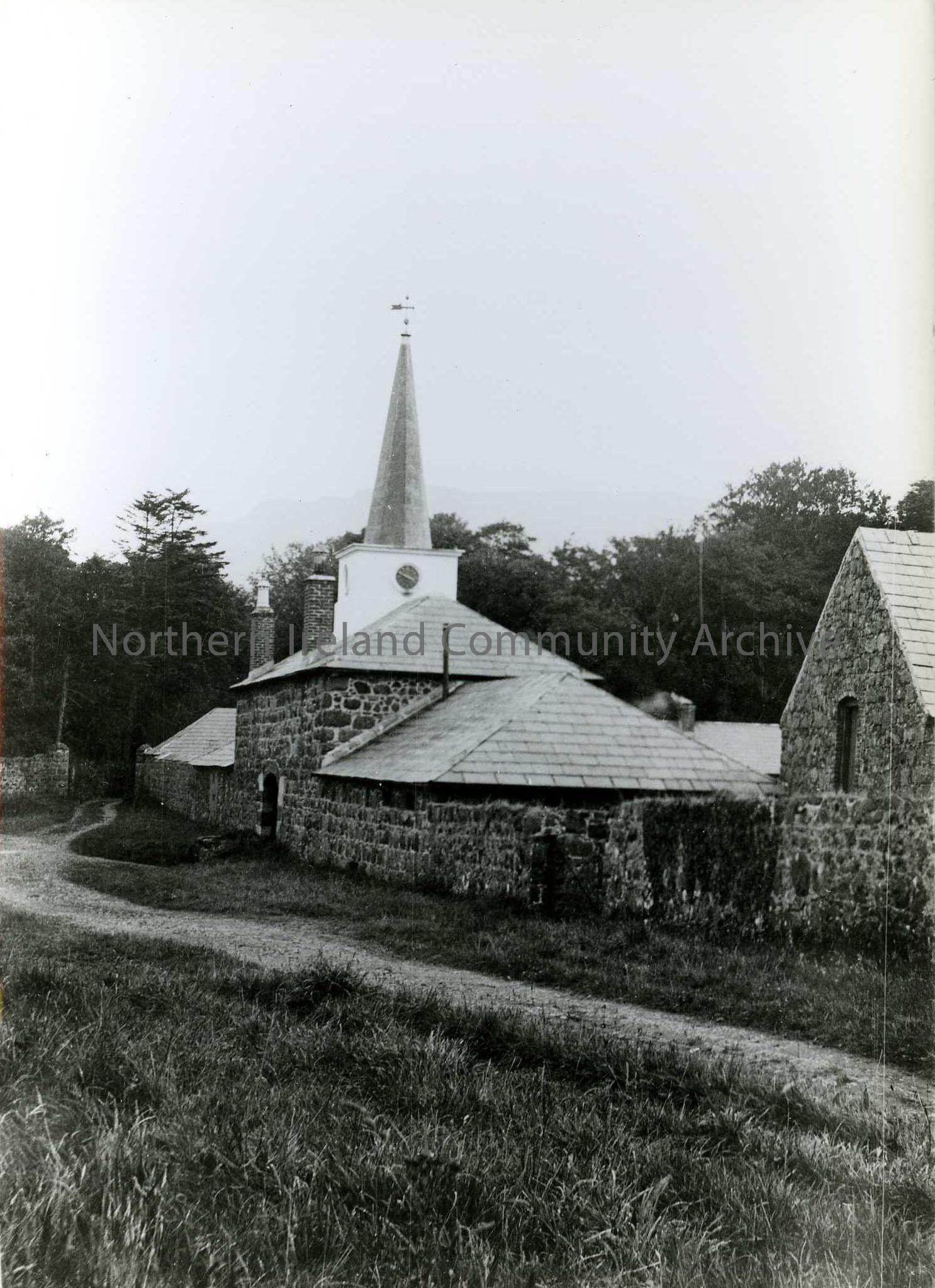 Printed black and white photograph – Stone buildings, one with a spire and clock.