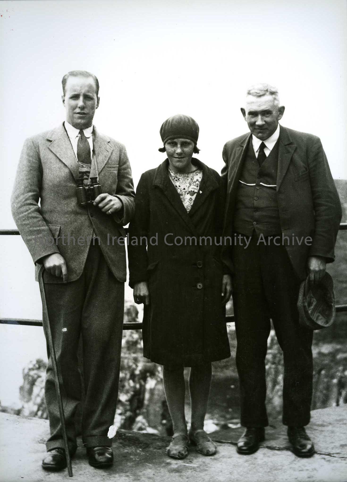 Printed black and white photograph – two men with a young girl, Rosie McFaul. According to John Moulden, man on right is Johnnie Martin