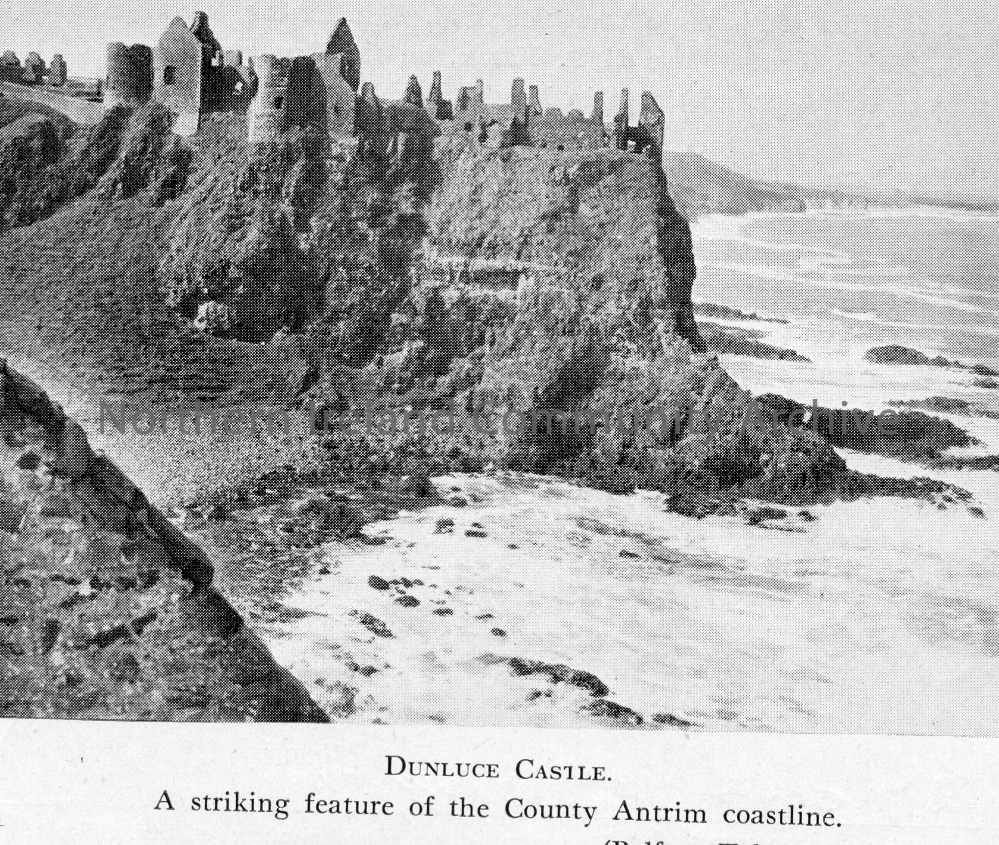 Printed black and white photographic image cut from a publication. Image of Dunluce Castle. Captioned, ‘Dunluce Castle. A striking feature of the Coun…
