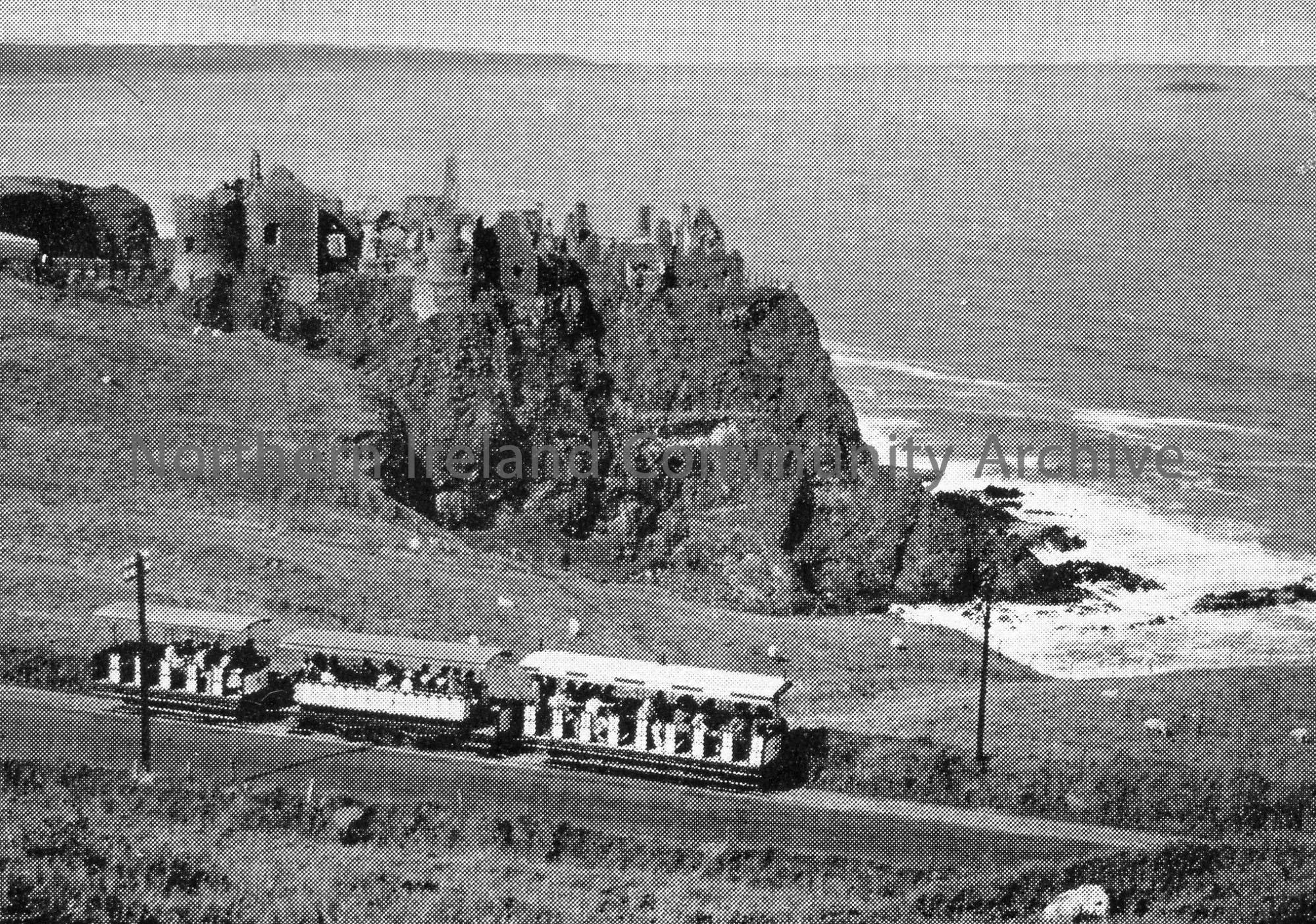 Printed black and white photographic image. Image of Dunluce Castle with a tram in the foreground. Image used in Sam Henry’s ‘Dunluce and Giant’s Caus…