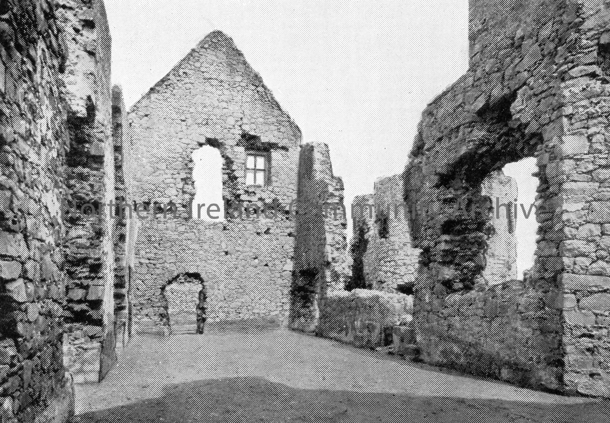 Printed black and white photographic image. Image of the inside of the ruins at Dunluce Castle. Used in Sam Henry’s ‘Dunluce and Giant’s Causeway’ boo…