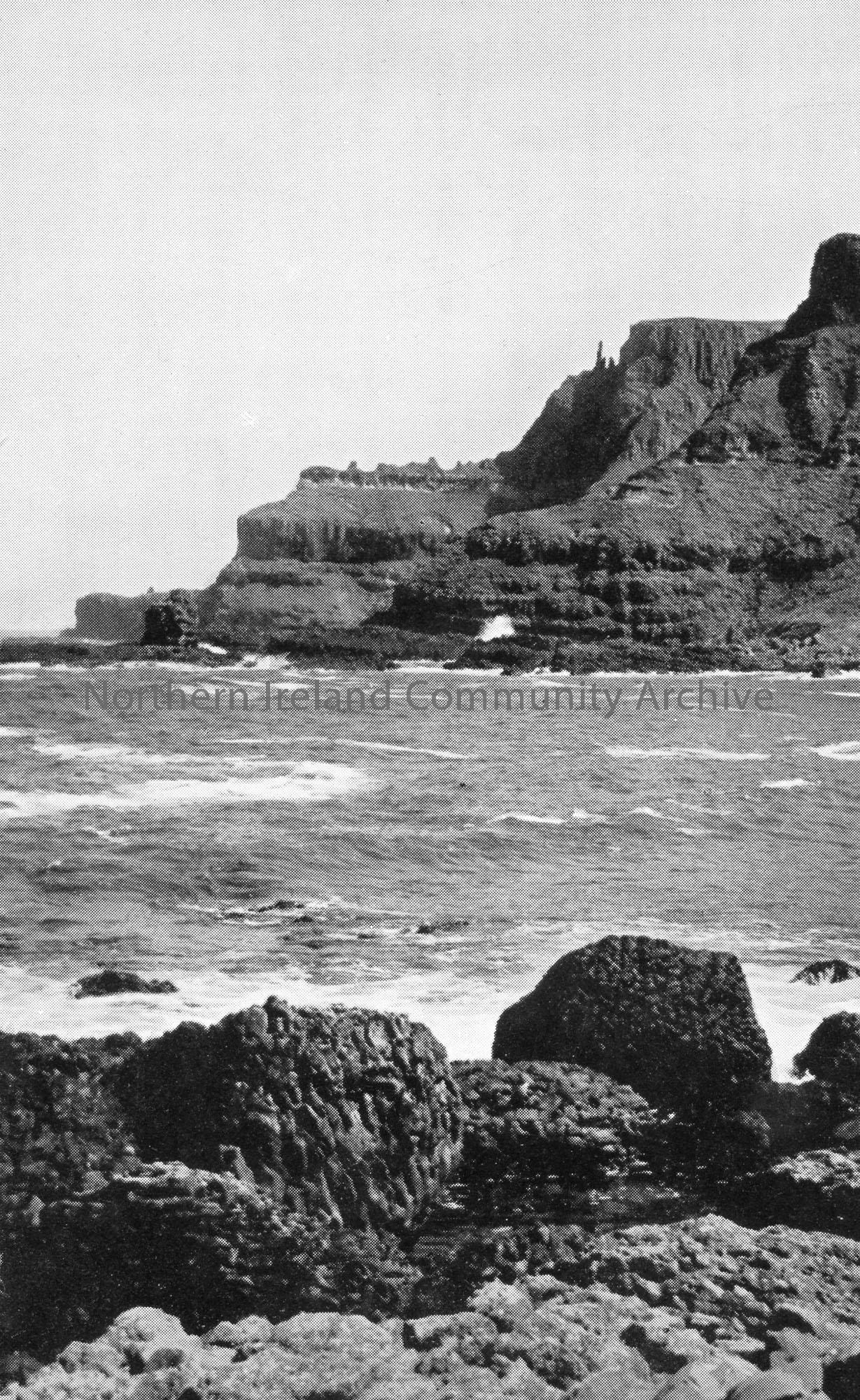 Printed black and white photographic image. Used in Sam Henry's book 'Dunluce and Giant's Causeway' - CM:2011:518 on page 59. It is captioned as 'Roverin Head and the Chimneys'.