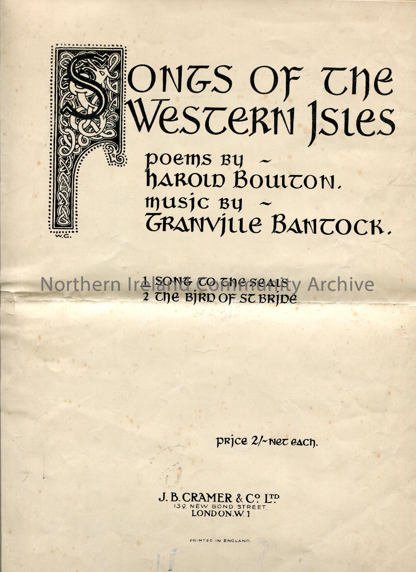 Printed booklet titled, 'Songs of the Western Isles. Poems by Harold Bouiton, Music by Granville Bantock'. Words and music to 'Song to the Seals'. List of Popular Song and Ballads on back page.