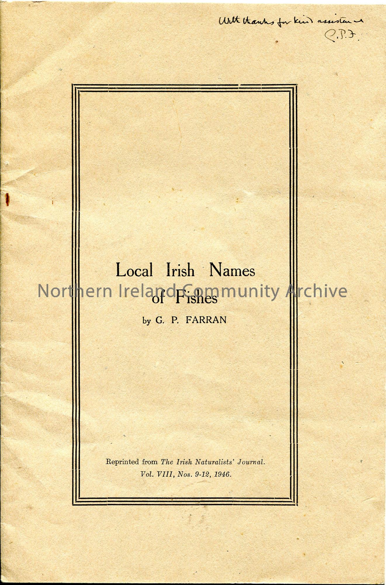 Printed booklet with brown cover titled, 'Local Irish Names of Fishes' by G. P. Farran. reprinted from The Irish Naturalists' Journal, Vol VIII, Nos. 9-12, 1946. 'With thanks for kind assistance. G. P. F' handwritten top of front cover. Sam Henry's name is present in the List of Authorities who helped with the Irish naming of fishes.