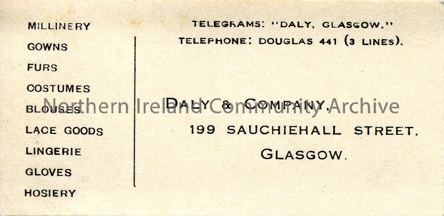 Printed business card for Daly & Company, 199 Sauchiehall Street, Glasgow – a clothing company. The name Miss Hotchkin’s c/o handwritten in pencil on …
