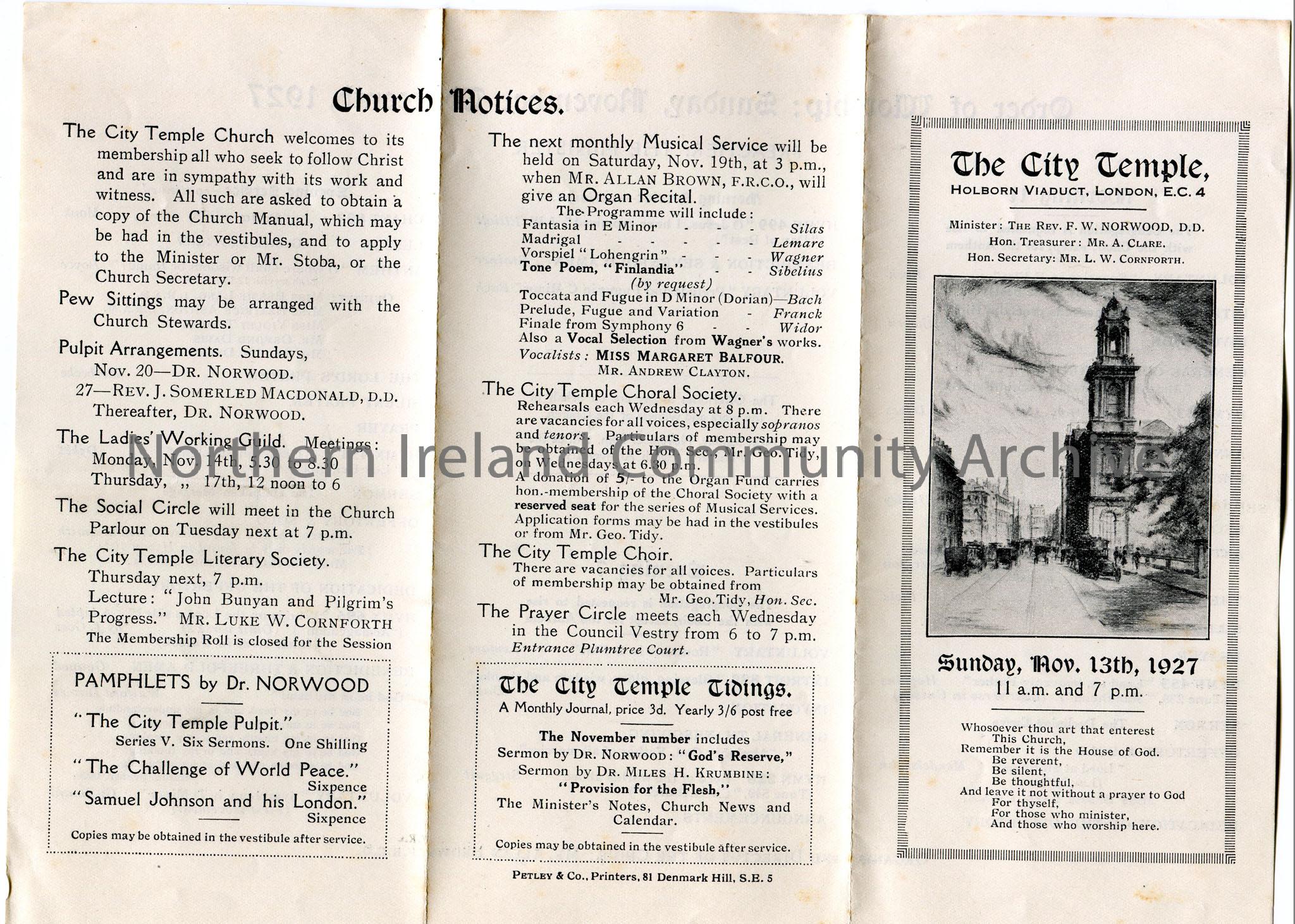 Printed Church leaflet for Sunday service at The City Temple in Holborn Viaduct, London. Dated 13th November, 1927. Image of the Church on front of leaflet.