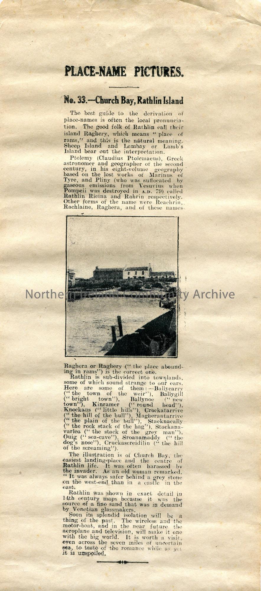Printed copy of an article which appeared in a newspaper. Titled, 'Place-Name Pictures. No. 33, - Church Bay, Rathlin Island'. Features a photographic image of the Church Bay. Article re the origin of the placename Rathlin.