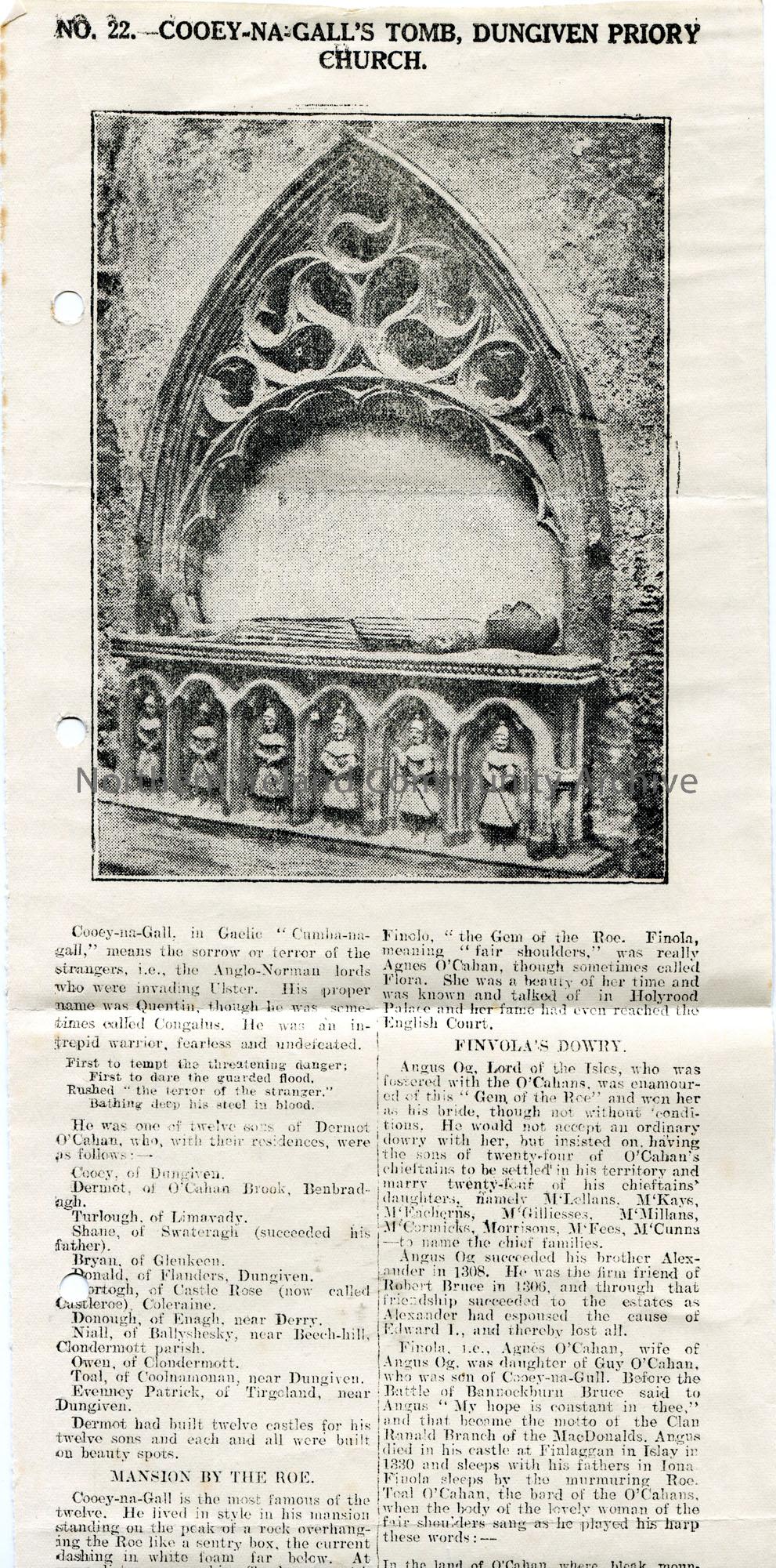 Printed copy of an article with photographic image titled, 'No. 22. - Cooey-Na-Gall's Tomb, Dungiven Priory Church'. Photograph is of the tomb itself. Re Cooey-na-Gall - warrior and one of twelve sons on Dermot O'Cahan - and Finvola / Finola 'Gem of the Roe'. 'Cooey-na-gall' handwritten in pencil on reverse.