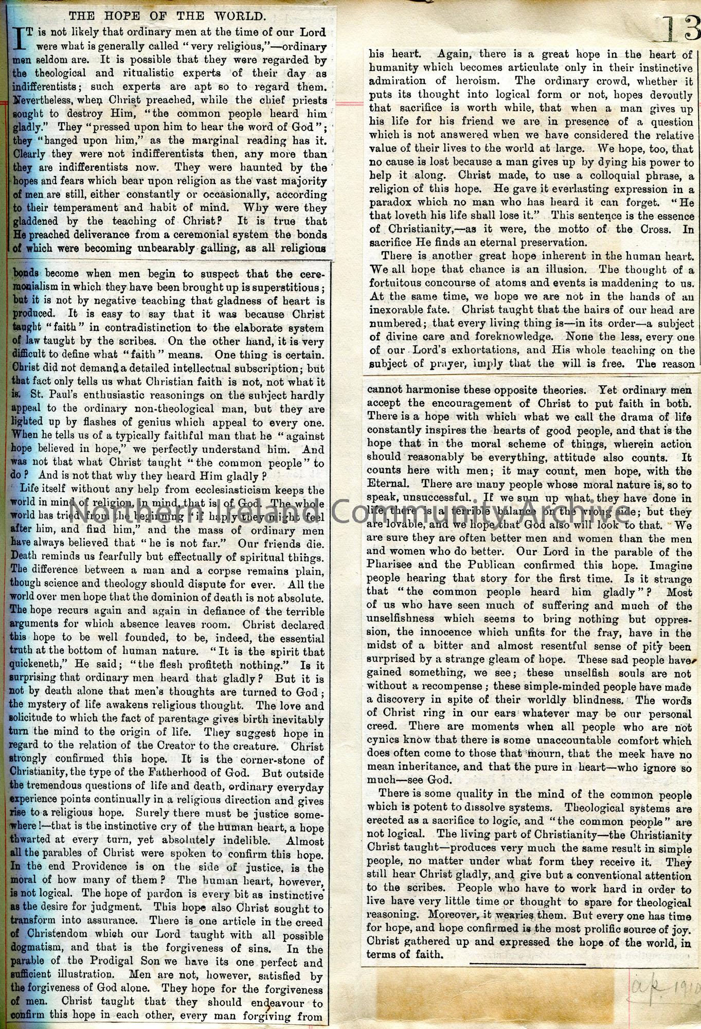 Printed cutting from a publication titled, 'The Hope of the World'. Dated April 1910 in pencil below cutting.