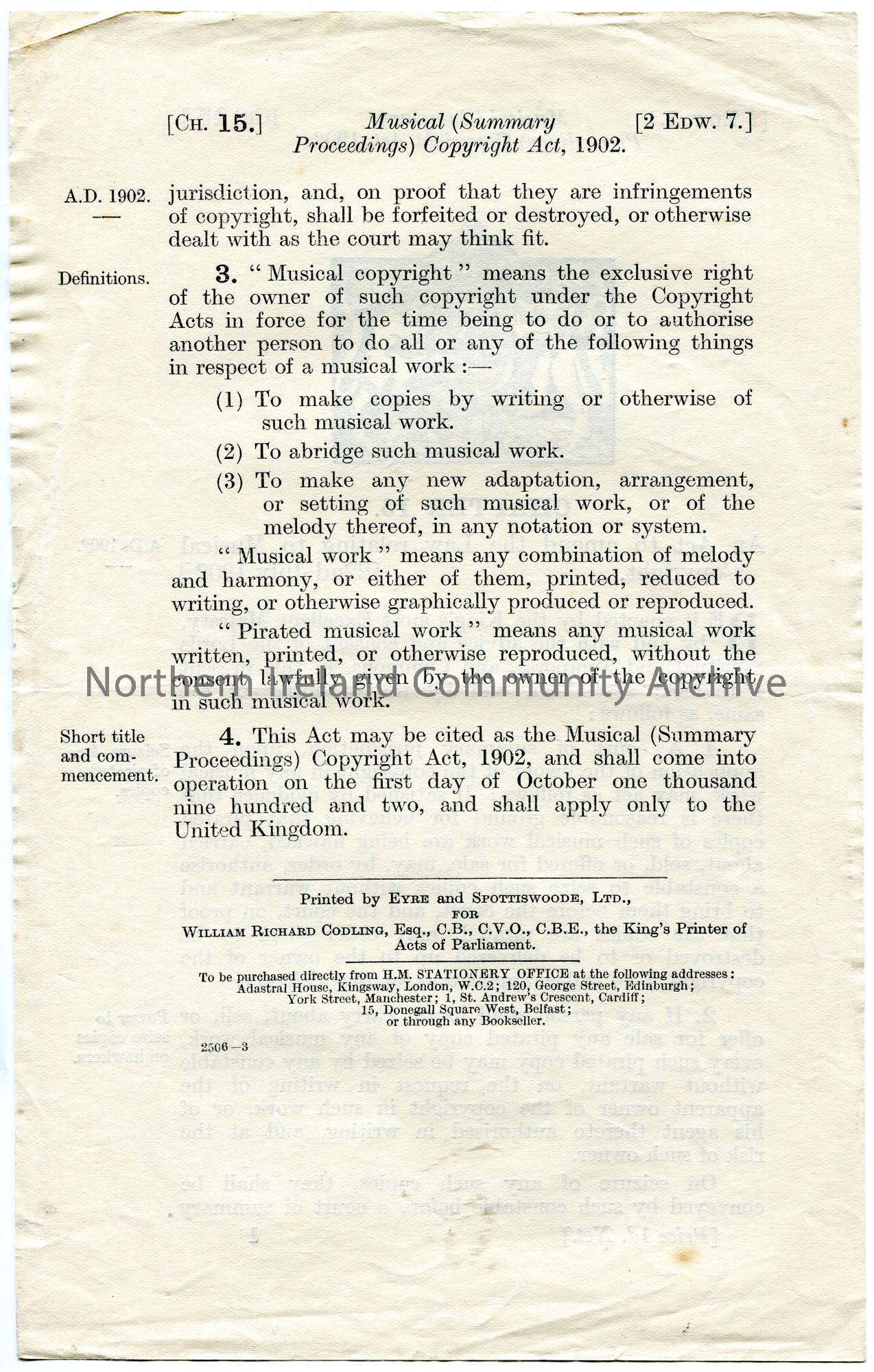Printed document (double sided) re 'Musical Copyright Act, 1902'.