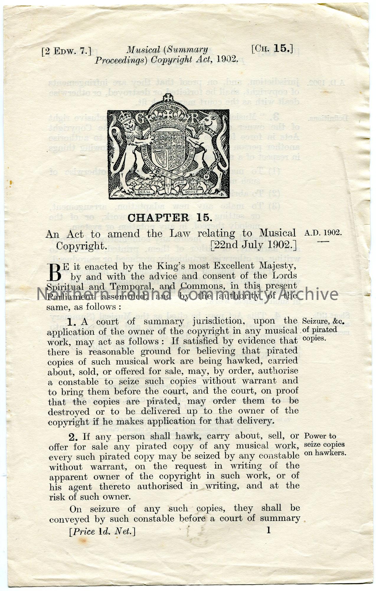 Printed document (double sided) re ‘Musical Copyright Act, 1902’.