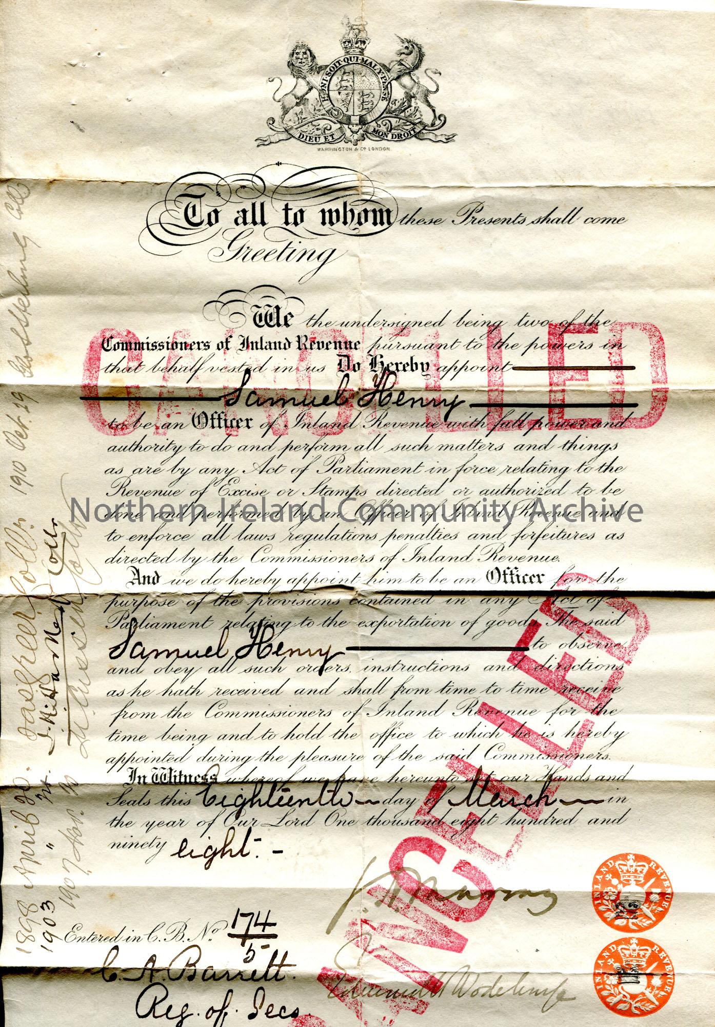 Printed document for the appointment of Samuel Henry as an Officer of the Inland Revenue on 18th March, 1898. Signed by two Commissioners of the Inland Revenue - J N Murray and Edmund ? Entered in C. B. No. 174 by C. A. Barrett, Ref of Secs. Two red 'CANCELLED' stamps over document. Handwritten dates and names on left margin and on reverse 1898-1929.