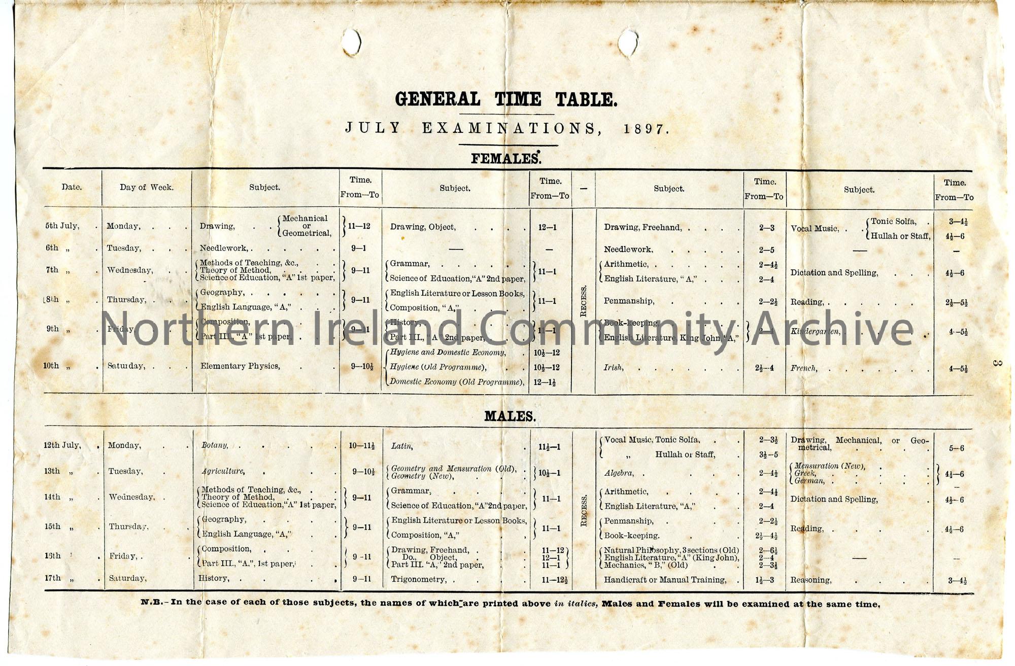 Printed document titled, 'Annual Examination. Authorization To Attend The Examination of 1897'. To Mr Samuel Henry, Blindgate St [Street] Coleraine. For examinations commencing 5th July 1897 at Coleraine Male Model School. Printed on the other two sides of the document are instructions for the examinations and timetables for male and females.