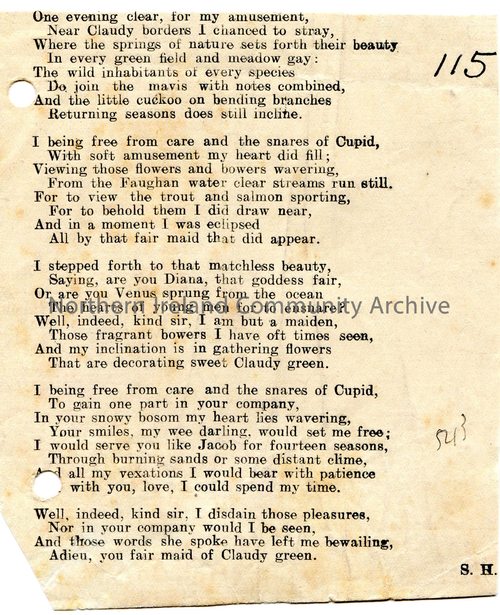 Printed five verse song or poem, numbered 115. ‘S.H’ initials at bottom of page. No title.