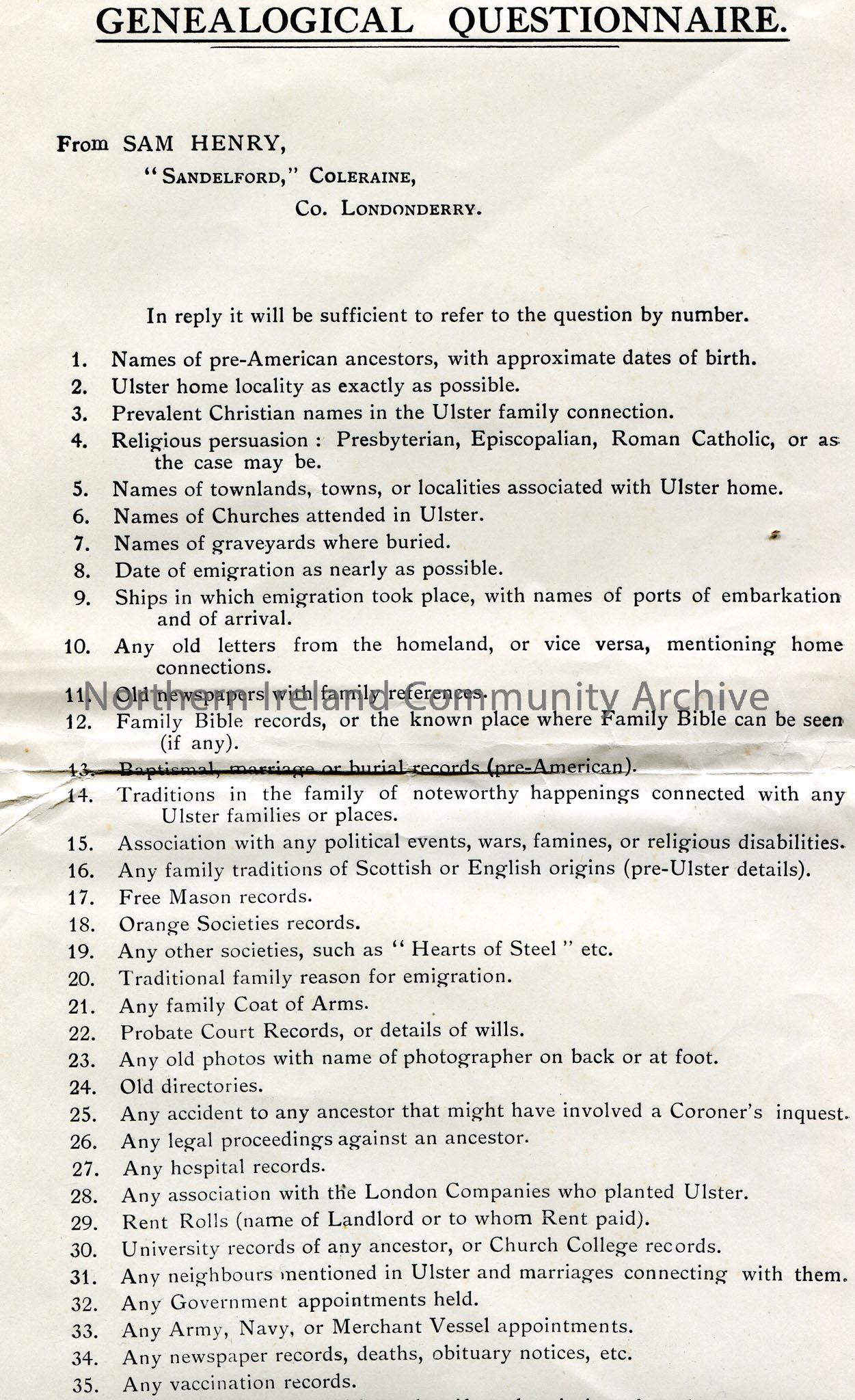 Printed Genealogical Questionnaire. By Sam Henry. List of 40 questions re marriage, records, deaths, notices, religion and other genealogical style questions.