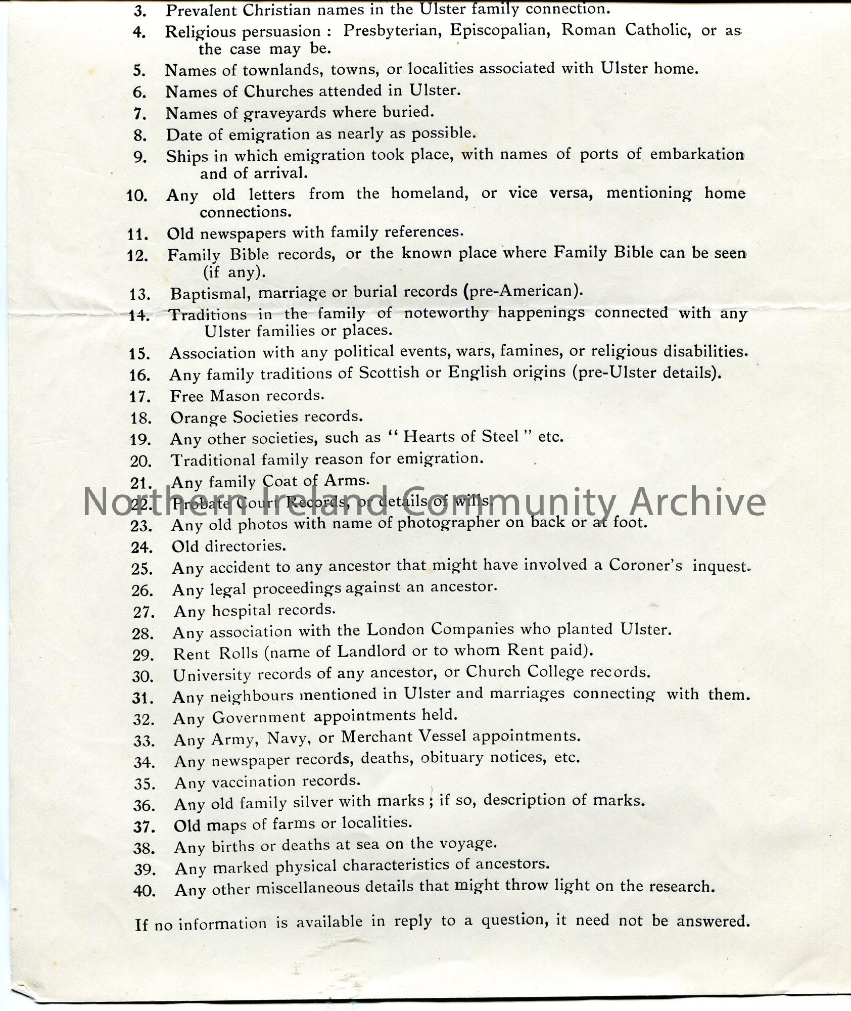 Printed genealogical questionnaire by Sam Henry, Sandelford, Coleraine, Co. Londonderry. List of 40 questions. Handwritten notes in pencil, not in con… – scan046b