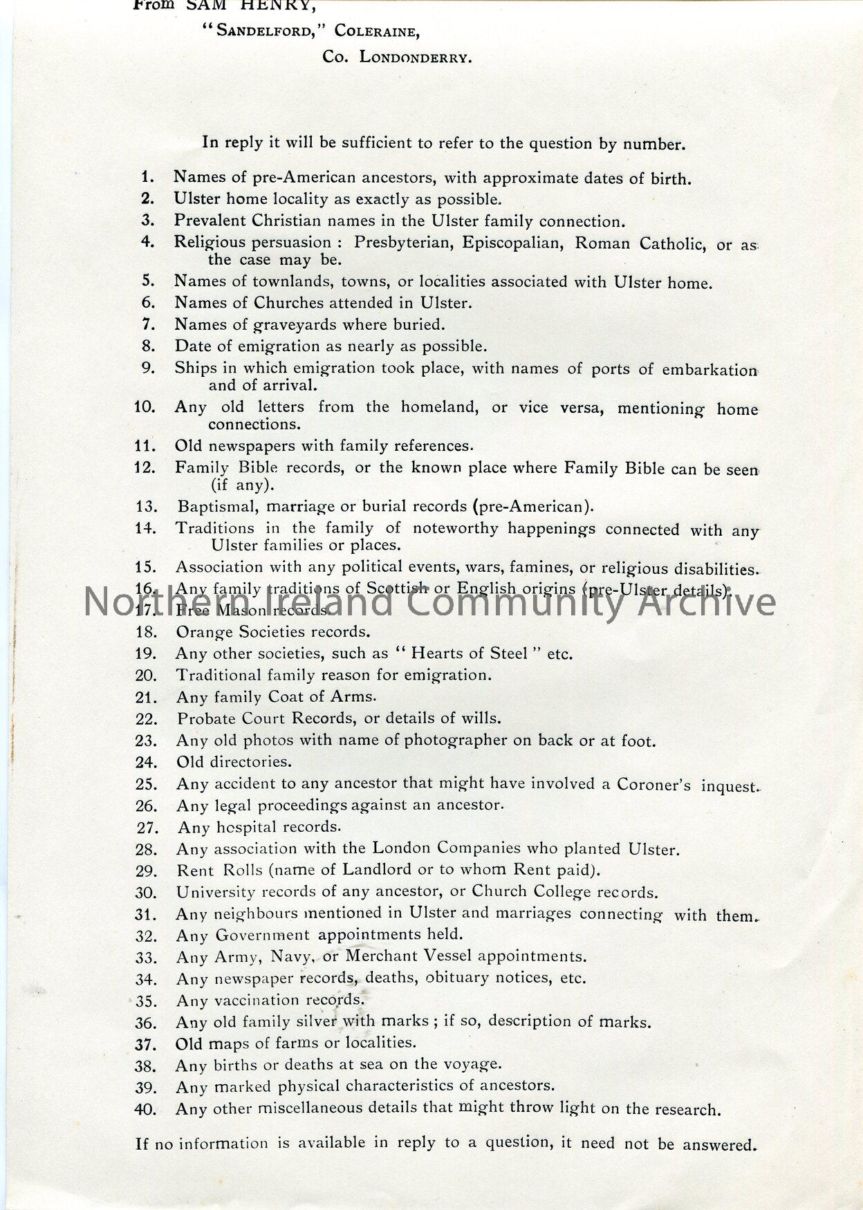 Printed genealogical questionnaire by Sam Henry, Sandelford, Coleraine, Co. Londonderry. List of 40 questions.