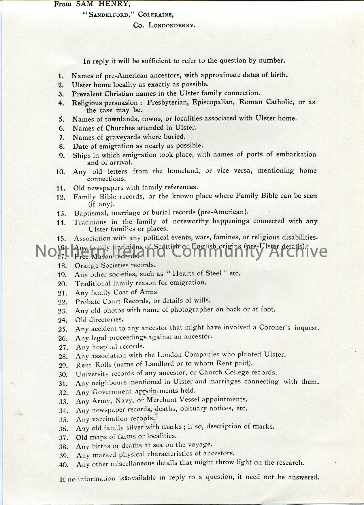 Printed genealogical questionnaire by Sam Henry, Sandelford, Coleraine, Co. Londonderry. List of 40 questions.
